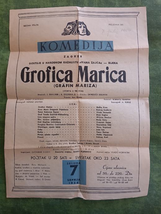 Prodajem mini plakat narodnog kazališta Ivan Zajc Rijeka, predstave grofica Marija, sezona 1953/1954. Plačanje na račun ili gotovina.