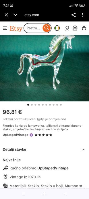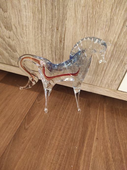 Figura od MURANO stakla,konj koji se preslikava ovisno o kutu gledanja te se može propeti na zadnje noge.Za sve informacije nazovite ili pošaljite upit na Viber ili njuskalo a saljem postom ili tiskom ili u dogovoru sa kupcem.Vidi slike!! Moguće kupiti zajedno sa vazom MURANO koja je na drugom oglasu,a vidi se u slikama.