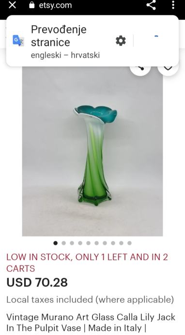 Murano Art Glass Calla Lily Jack. Predivne ručno puhane vaze u obliku cvijeta kale. Visina 18 i 22 cm. Cijena je za komad