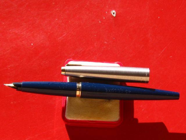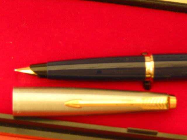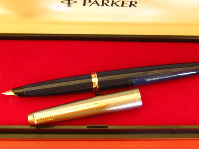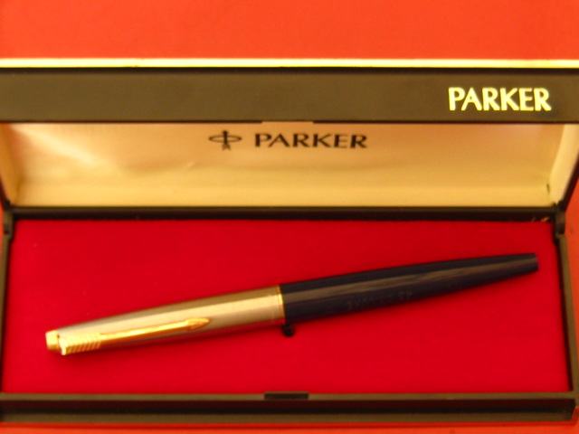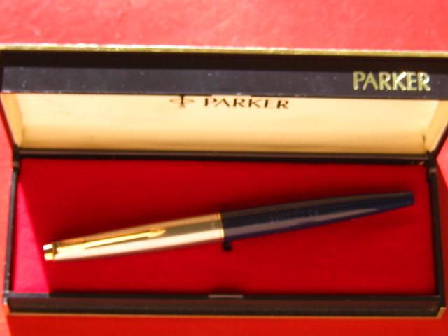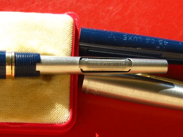 Original vintage "PARKER" 45 DE LUXE...1960. godina..England.. zlatno pero...poznato kao GT, izuzetno uspješno nalivpero ...elegantan dizajn, vrlo lagano, dobra ravnoteža...poklopc brušeni čelik, pozlaćena klipsa...medium pero...original kutija...SUPER STANJE, KAO NOVO.