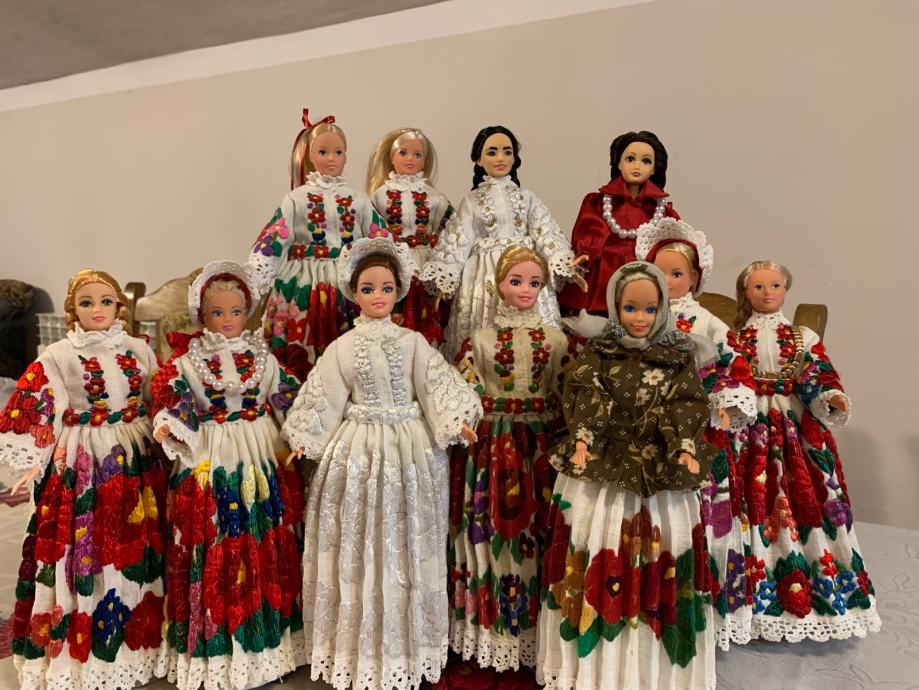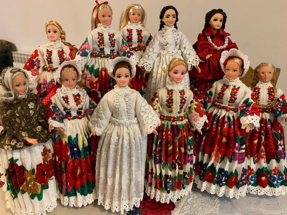 Lutke u narodnoj nošnji Banovine. Lutke su u veličini barbi lutke, vezene svilom na lanenom platnu, istovjetne originalnoj nošnji.