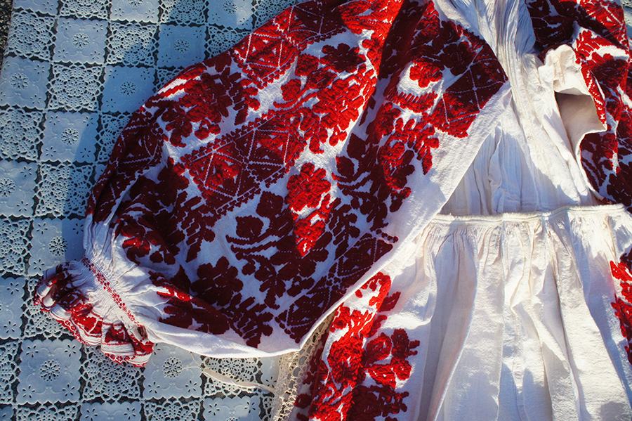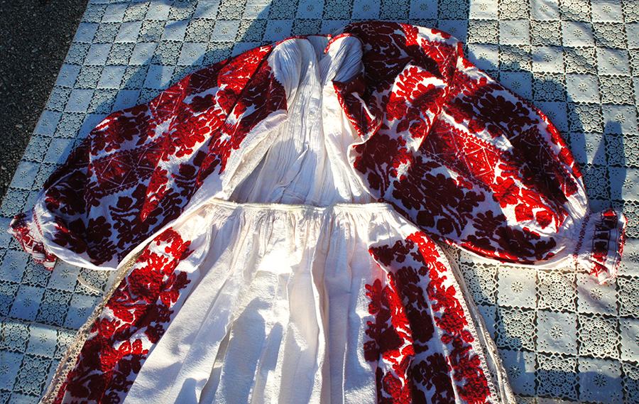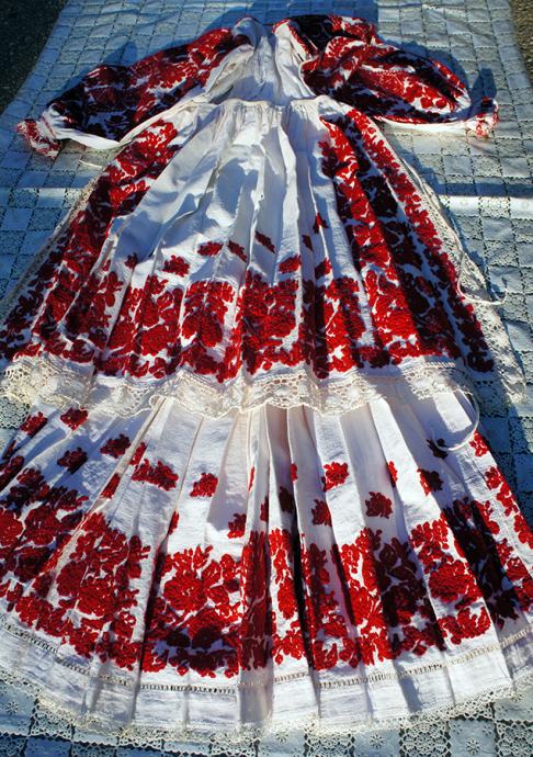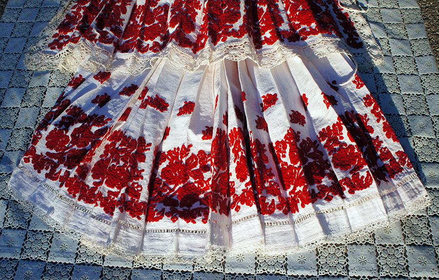 Posavska narodna ženska nošnja sa crvenim pismom, ručno rađena, komplet: opleće (bluza), rubača (suknja) i zaslen.