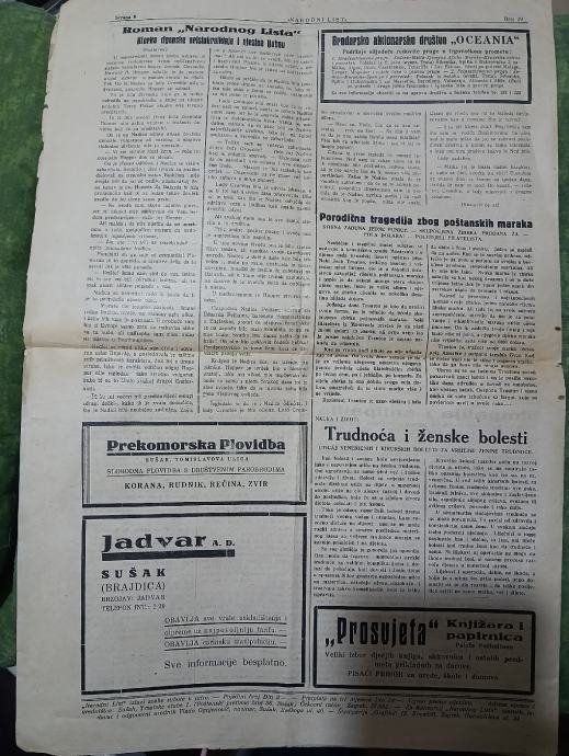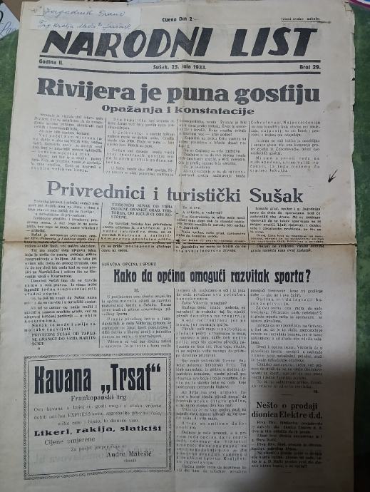 Prodajem dnevne novine Narodni list iz 1933g, osam stranica, rijetkost. Plačanje na račun ili gotovina.