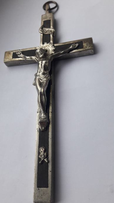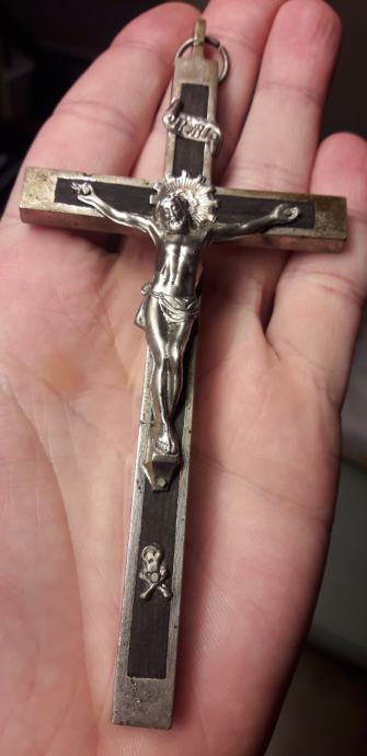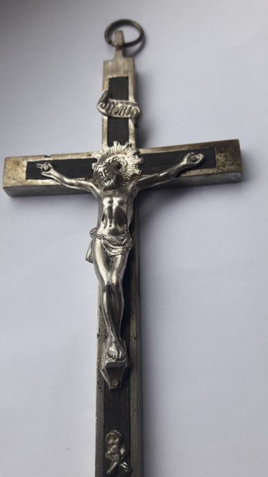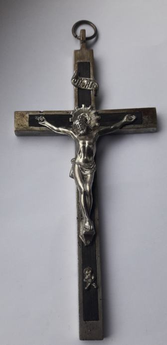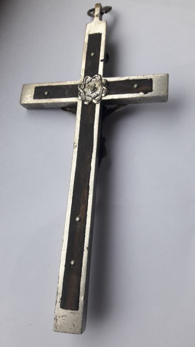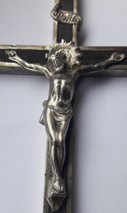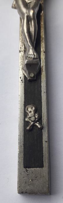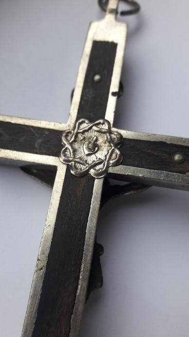 Bakrena legura (bronca). Izvorna posrebrena prevlaka sačuvana je u cijelosti. Potpuno kompletan. Intarzija od ebanovine. Savršeni detalji, jasan i čitljiv natpis na INRI pločici. Ispod Isusovih nogu nalazi se lubanja s kostima (Adamova glava).