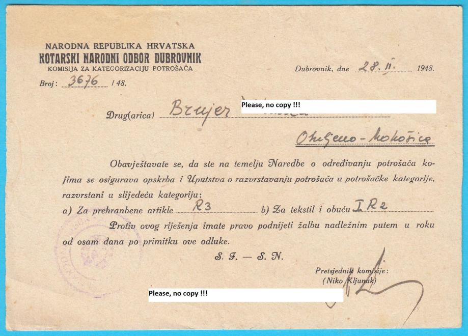 OBULJENO - MOKOŠICA Kotarski N.O.O. Dubrovnik stari dokument iz 1948.