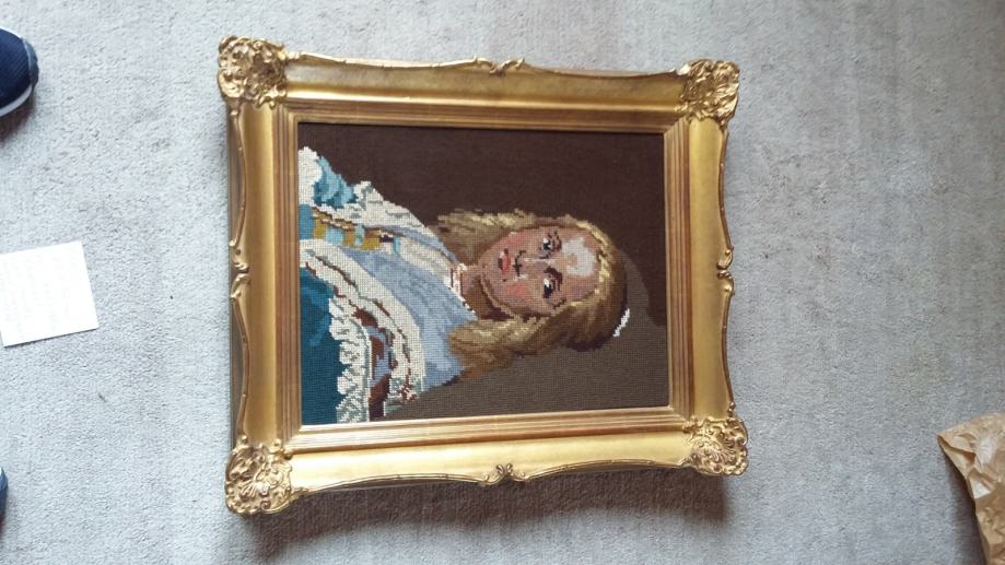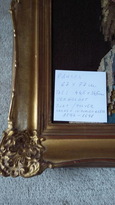 Slika mlada dama ,rucno stikanona na platnu.Okvir pozlacen 18 karatnim zlatom.Velicina;67 X 77cm s vanjska velicina,44,5 X 34,5 cm u falcu (velicina slike)