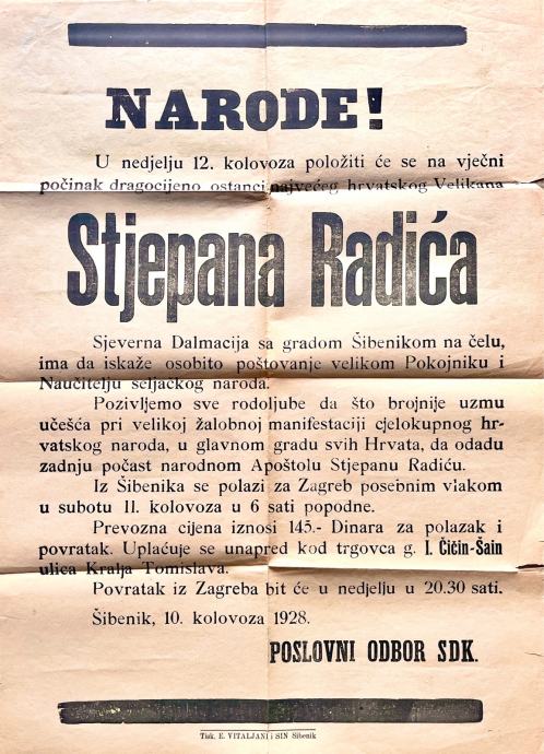 Nudim originalni povijesni plakat iz 10. kolovoza 1928., kojim se građani Sjeverne Dalmacije pozivaju na organizirani odlazak u Zagreb radi posljednjeg ispraćaja Stjepana Radića, jednog od najvažnijih hrvatskih političkih vođa 20. stoljeća.