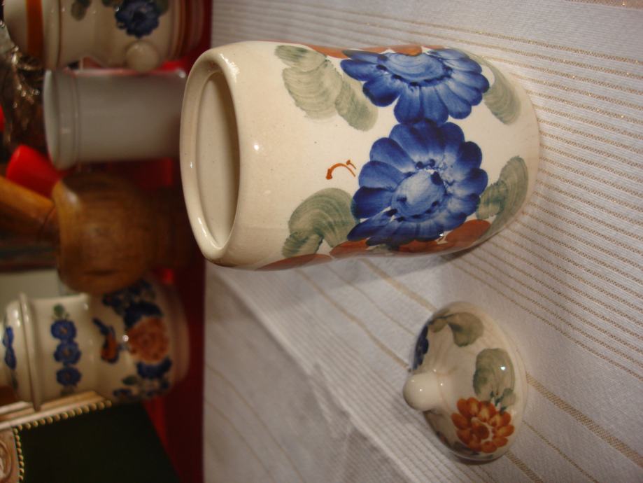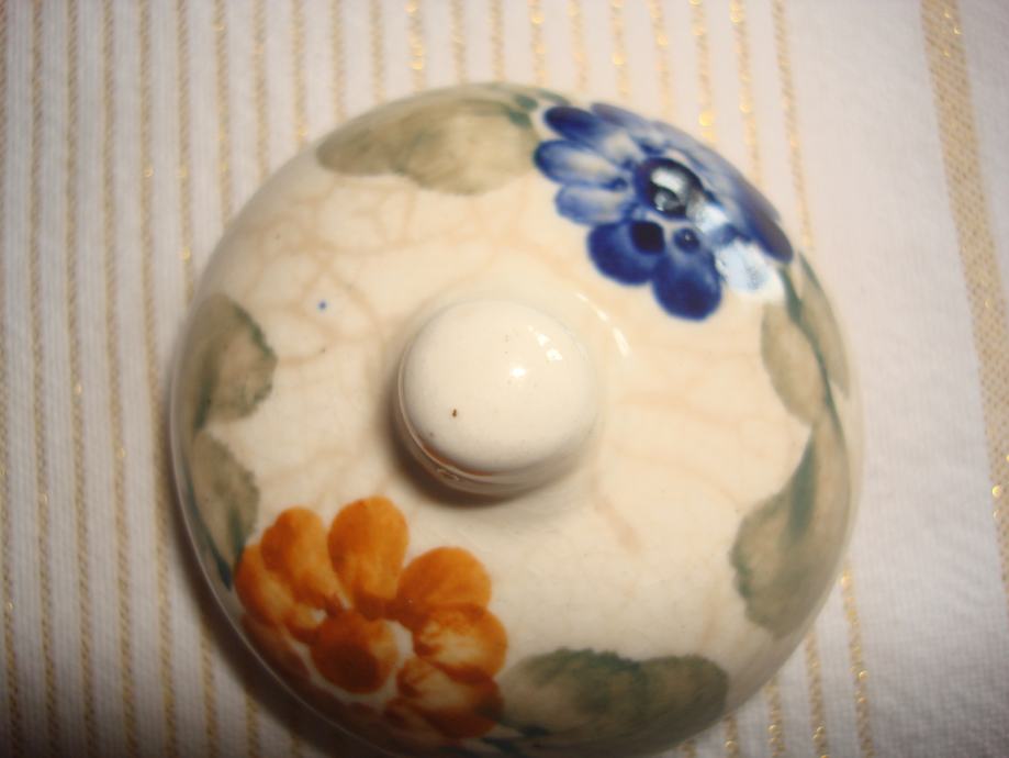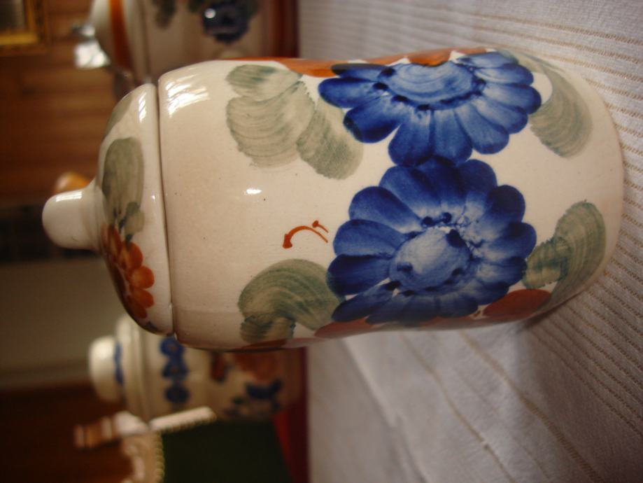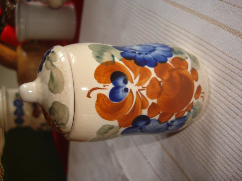 Prodajem oslikanu keramičku posudu s poklopcem, visine 13,5 cm (bez poklopca 11 cm), promjera 7,5 cm, poljska keramika za 12 eura. Potpuno je očuvana.