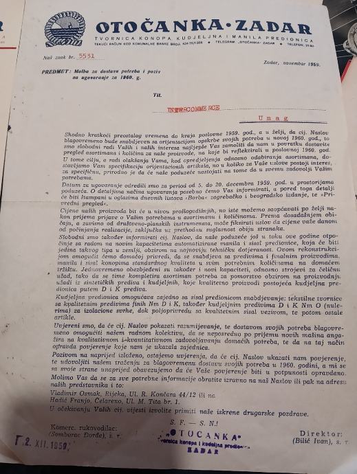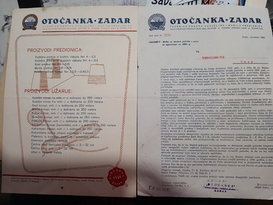 Prodajem lot od molbe za dostavu potreba i poziv na ugovaranje za 1960g i proizvodi užarije Otočanke Zadar, pečat 12. 12- 1959g. Cijena za lot. Plačanje na račun ili gotovina.