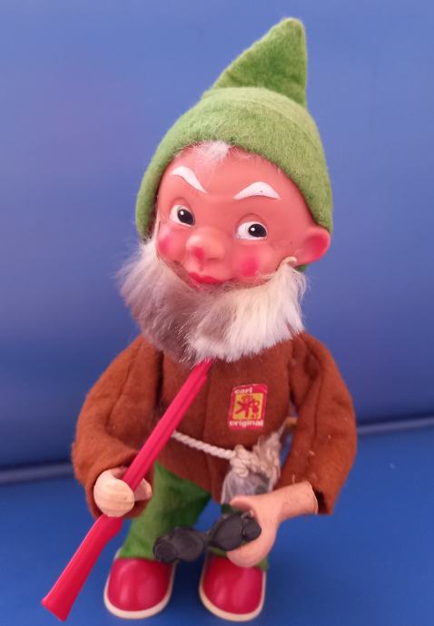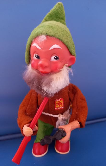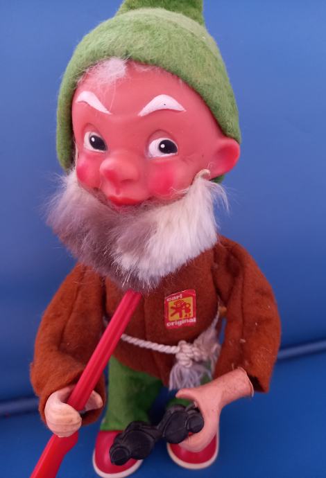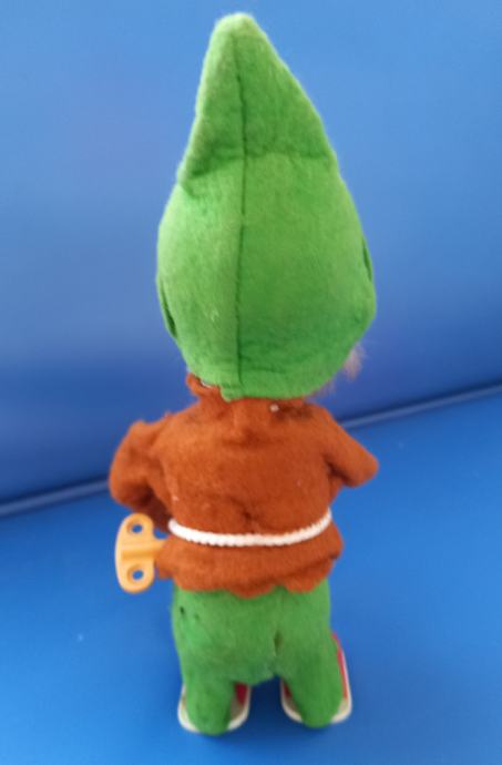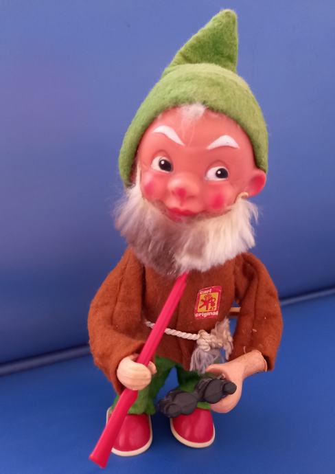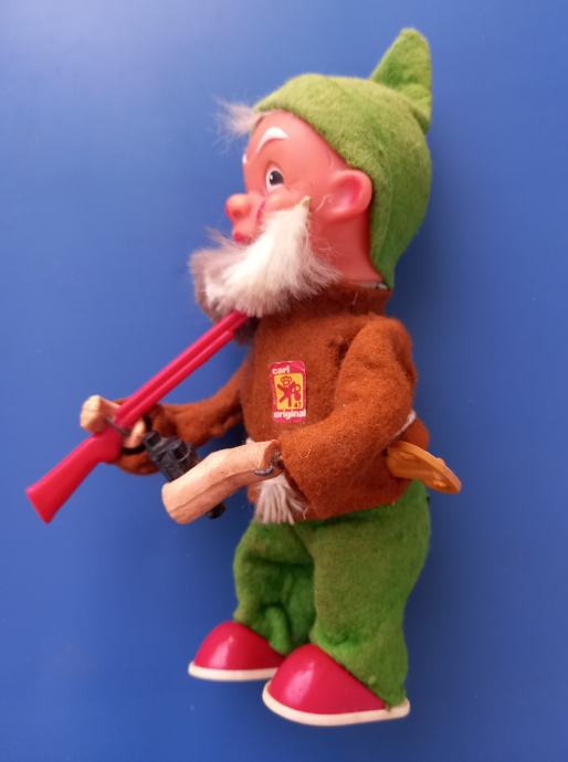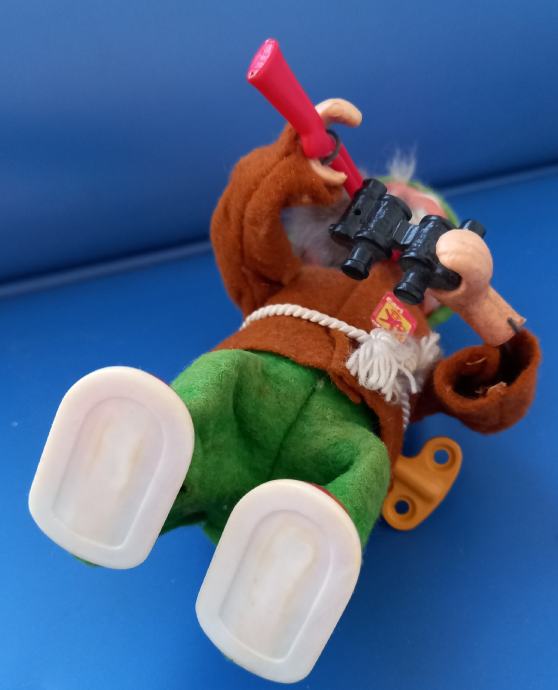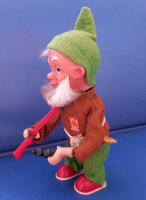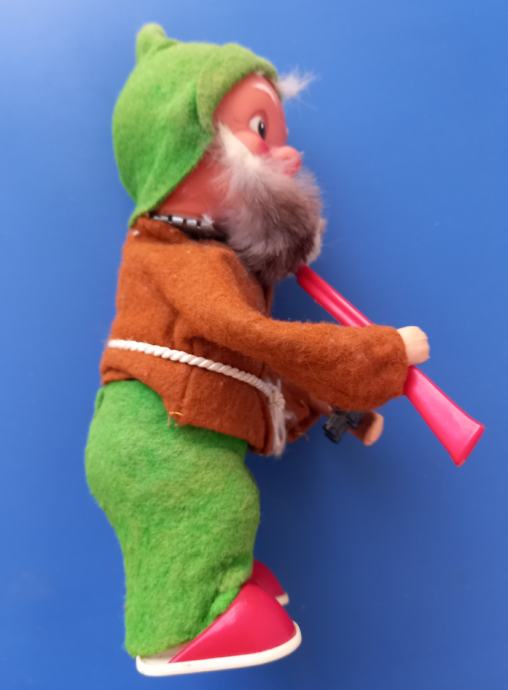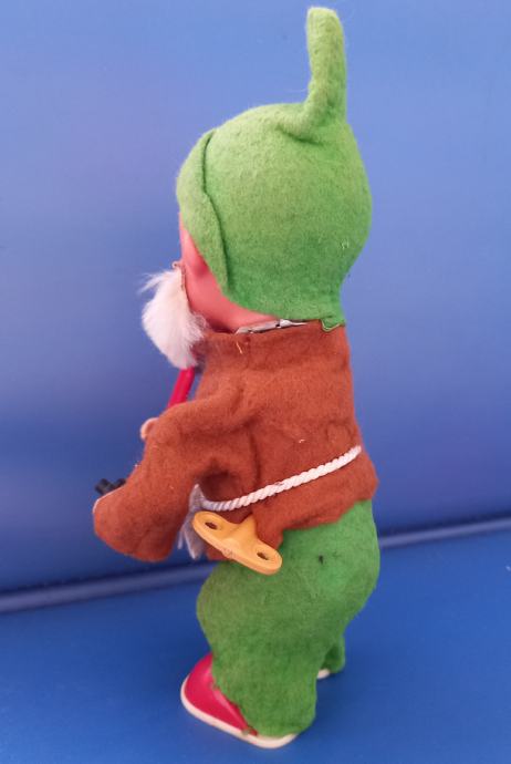 Raritet, predivna stara mehanička igračka u dobrom stanju iz pedesetih godina..Igračka radi na navijanje..kada se lagano okreće( navija) ključ,patuljak pomiće glavu i ruke..Mehanizam radi samo dok držite ključ i lagano okrećete