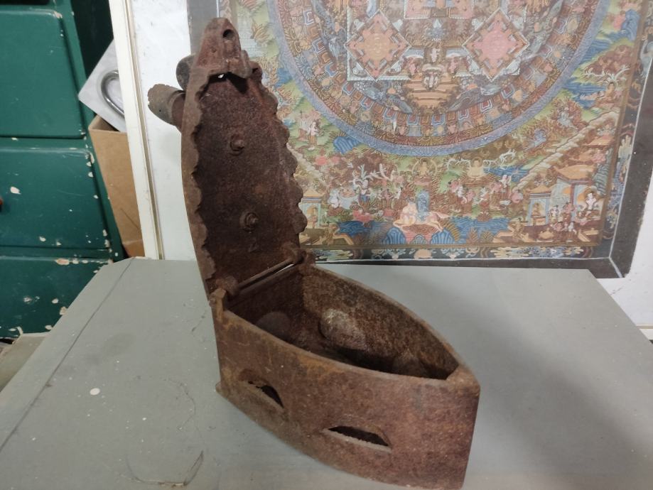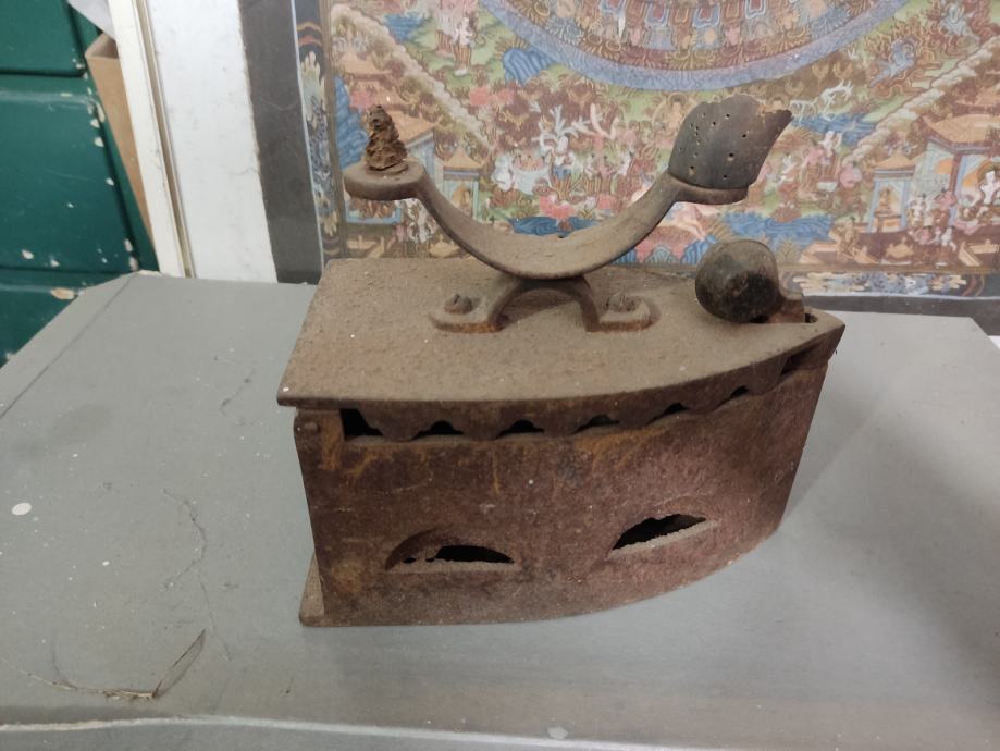 Stara neuređena pegla s oštećenom drvenom ručkom. Najboljem ponuđaču.