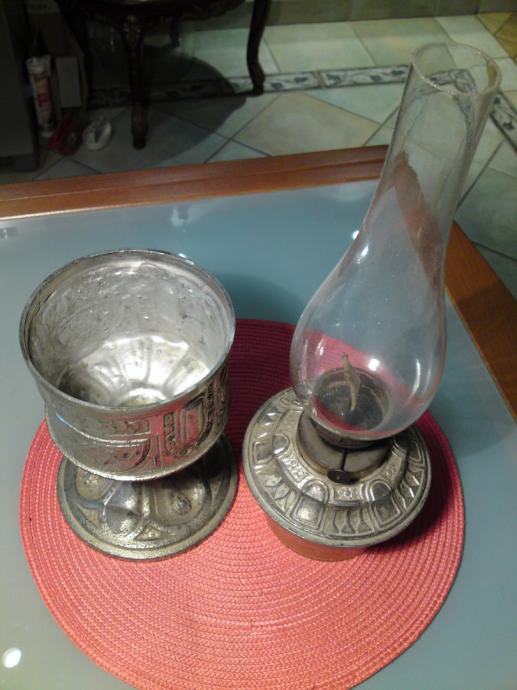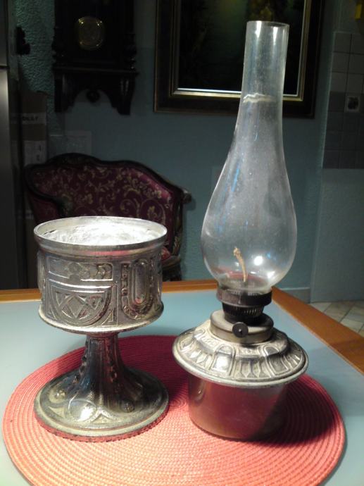 Stara petrolejska lampa iz perioda secesije , materijal: kositar, staklo; u odličnom stanju, sa staklenim spremnikom za petrolej i staklenim cilindrom.. Dimenzije: visina bez cilindra. 25,5 cm; visina sa cilindrom: 48,5 cm; promjer stope: 13,5 cm.