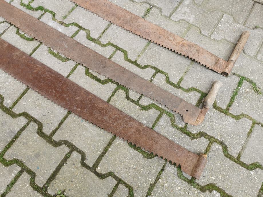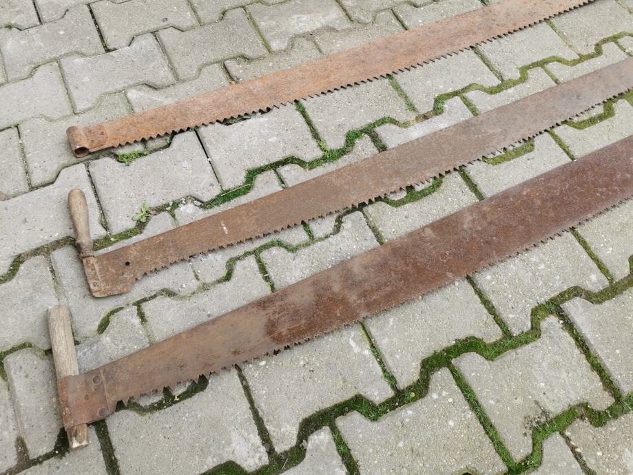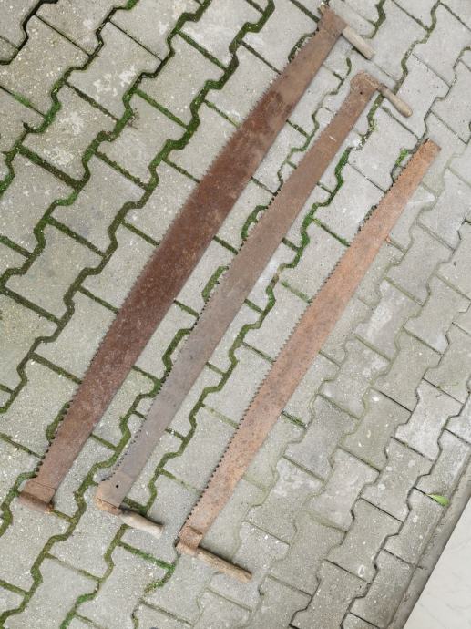 Šumske ručne pile, starina. Duljine 158 cm, u najširem dijelu 10 cm. Odlična dekoracija za opg-ove, restorane, klijeti... , ali i moderne interijere ! Kolekcionar kolekcionaru. Moguće slanje kupcu uz trošak dostave od 40 kn.