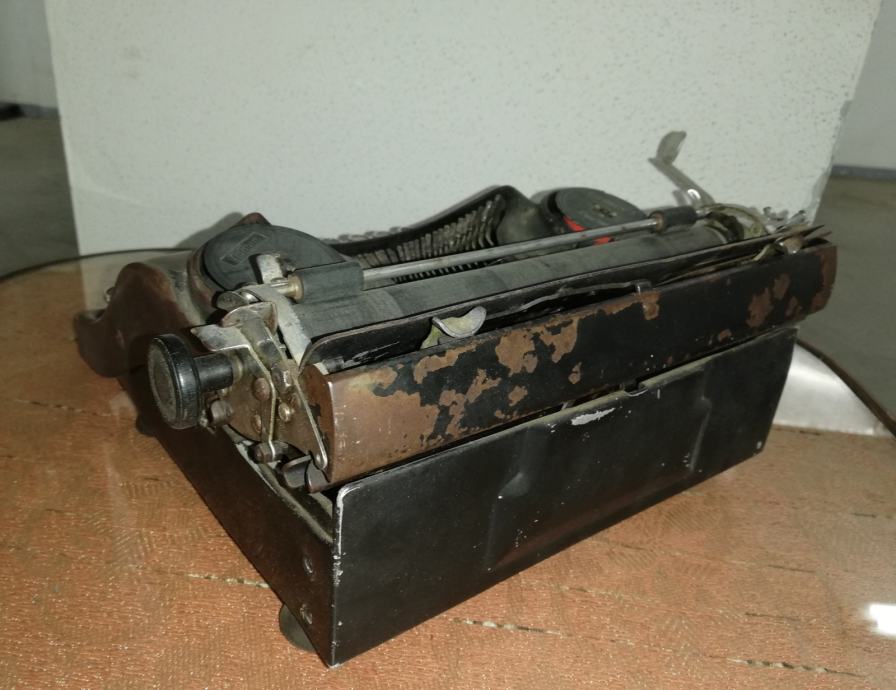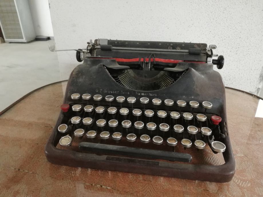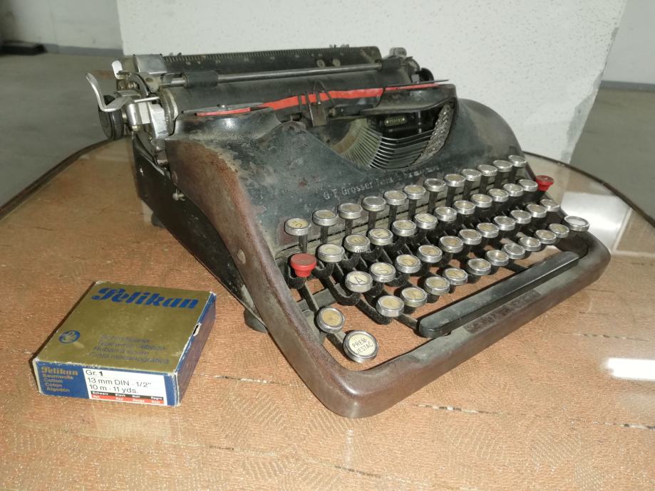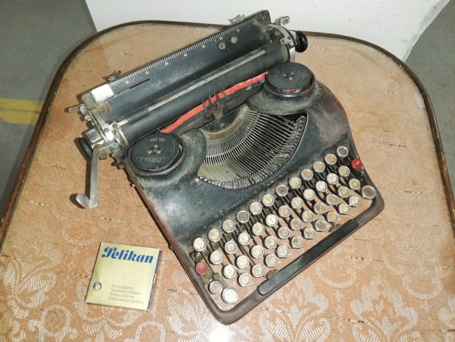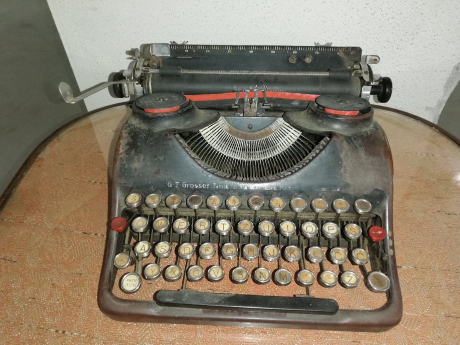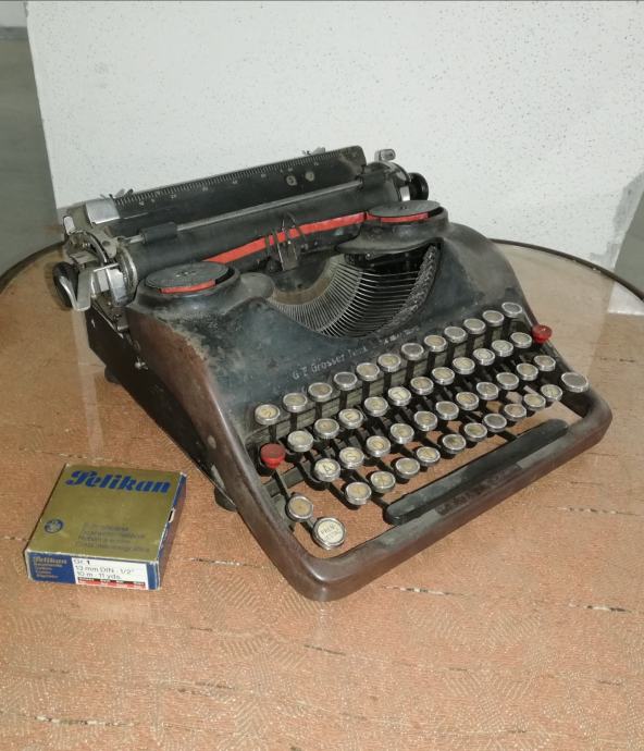 Mehanički prijenosni pisaći stroj Groma Model N iz 1943 g. . Na prednjoj strani je natpis "GF Grosser - Fabrik für Büromaschinen, Markersdorf/Chemnitztal, " Model N" i logo tvrtke . Materijal: Metal & Plastika & Guma; drvo i koža. Dinenzije: Duljina: 290 mm Širina: 330mm / Visina: 145mm /Težina: 5,6 kg.