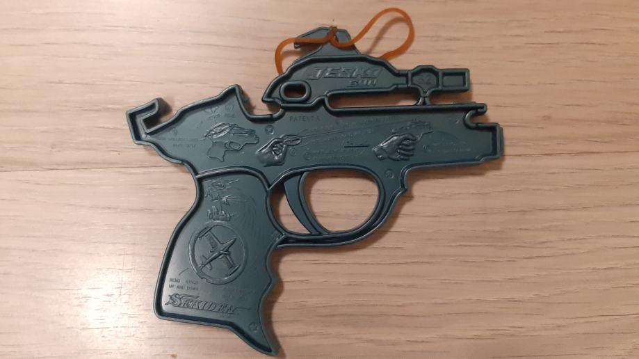 ORIGINALNA OKO 50 GODINA STARA IGRAČKA U ODLIČNOM STANJU. PORED PIŠTOLJA JE SVIH 26 ORGINALNIH DISKOVA. IGRAČKO JE BILO MOGUČE DOBITI U NAGRADNI IGRI BAZOOKA JOE, ŽITA LJUBLJANA, U 70. GODINA.