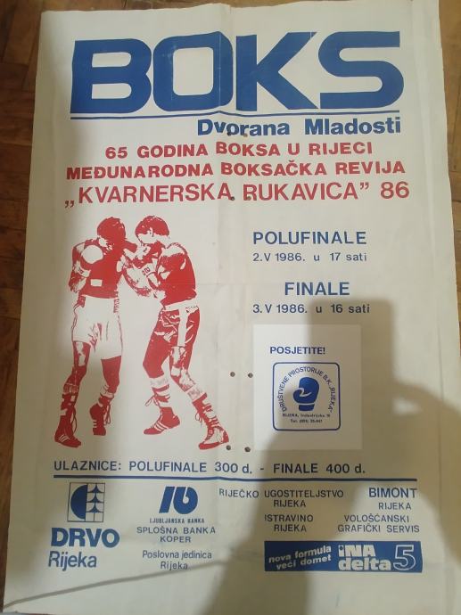 Prodajem originalni plakat "Kvarnerska rukavica 86", 65 godina boksa u Rijeci, međunarodna boksačka revija u dvorani Mladosti. Plakat po visini 70cm, dužina 50cm. Plačanje na račun ili gotovina.
