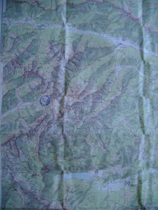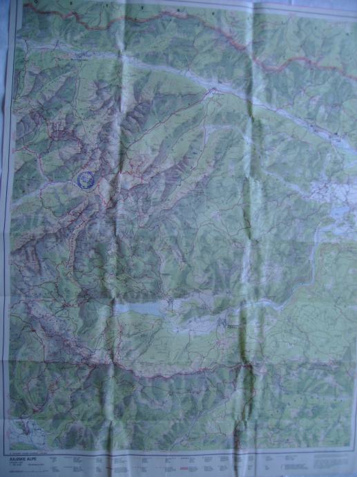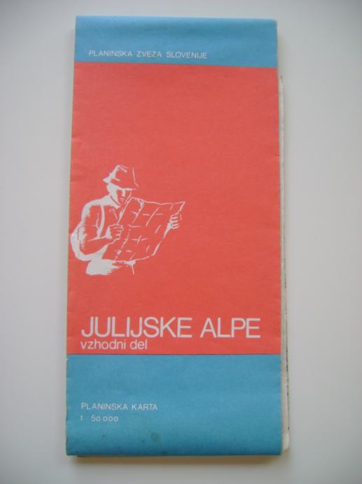 Zemljovid - planinarska karta - Julijske alpe, istočni dio, 1 : 50000, izdavač Inštitut za geodezijo in fotogrametrijo Ljubljana, tisak Vojnogeografski institut, 1988. godine, 67 x 87 cm. Karta je odlično očuvana i sadrži planinarske žigove iz 1989. godine - sve je vidljivo na slici.