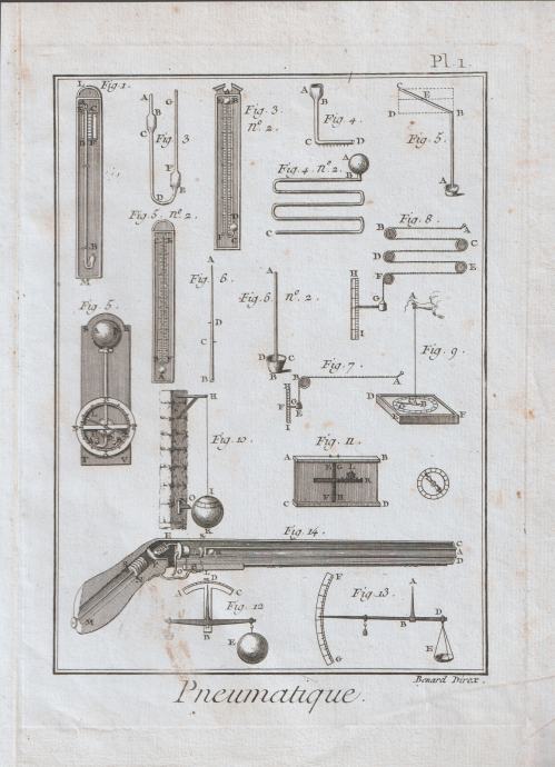 Riječ je o znanstvenoj ilustraciji iz 18. stoljeća koja prikazuje instrumente i pokuse iz područja pneumatike (fizika zraka i tlaka). Tabla sadrži niz numeriranih figura – cijevi, mjerne instrumente, pumpe, utege, balansne sustave i eksperimentalne naprave – precizno tehnički nacrtane u maniri prosvjetiteljskih enciklopedijskih izdanja.
