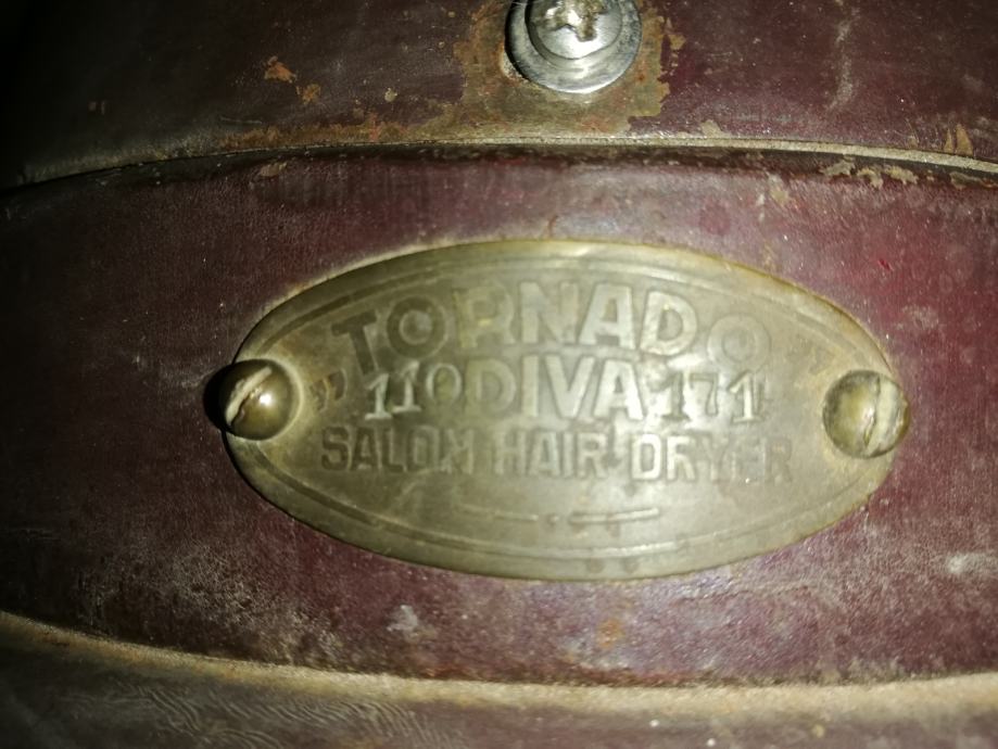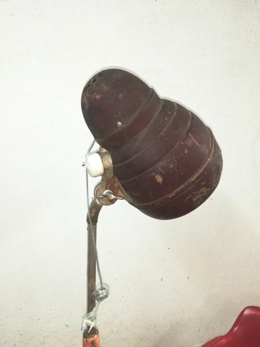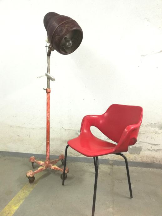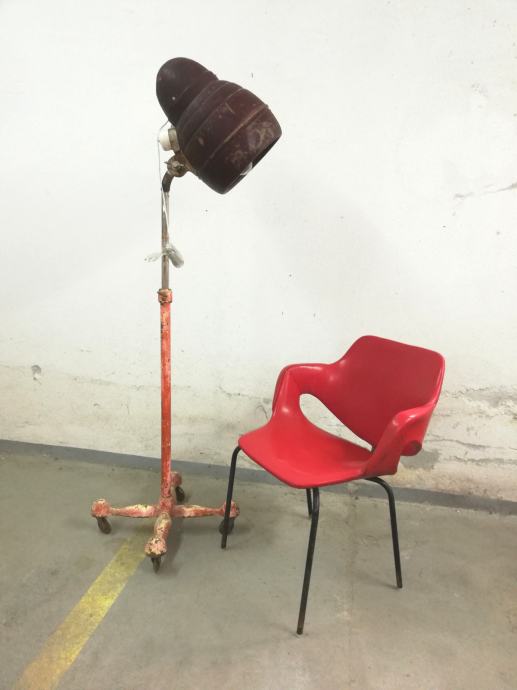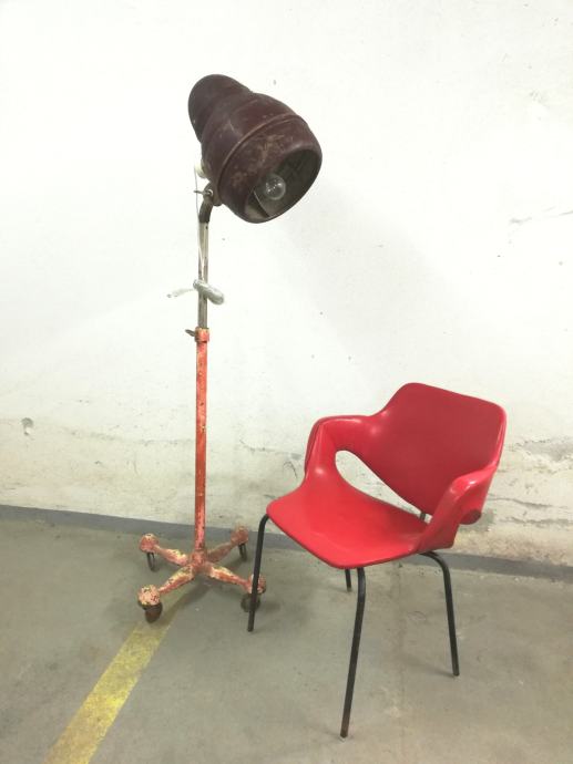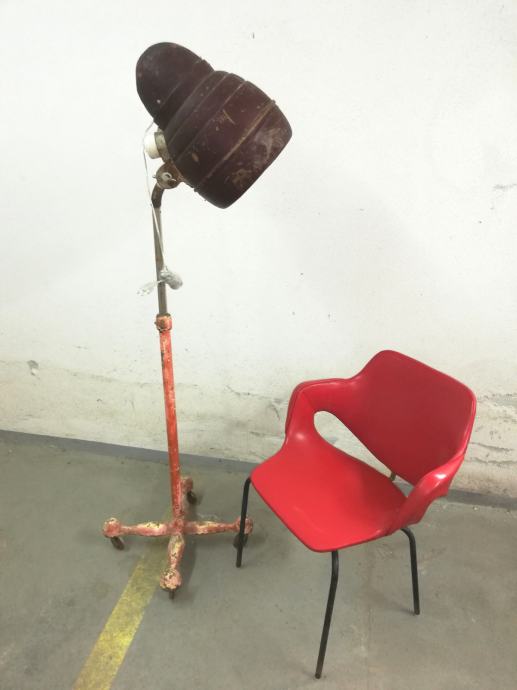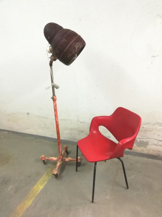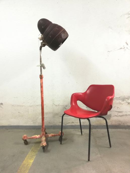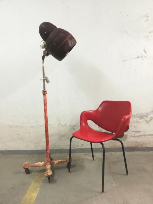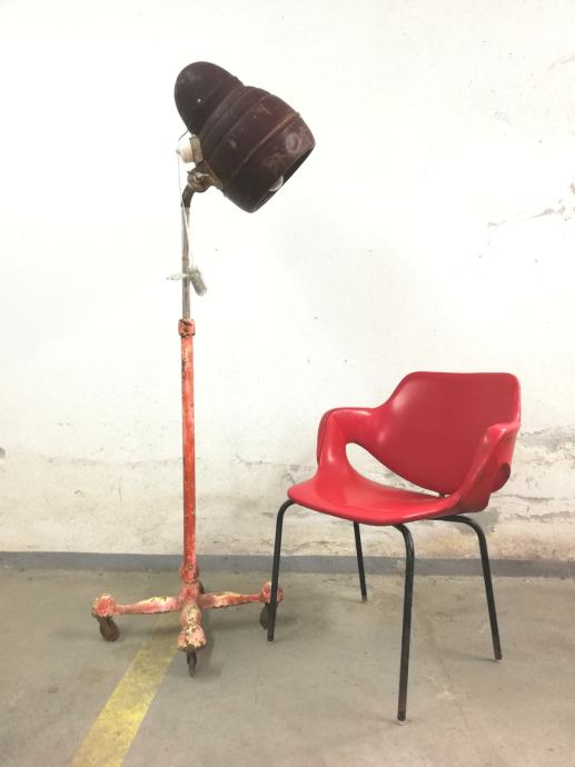 Podna svjetiljka, industrijski dizajn, elektrificirana stara hauba za sušenje kose iz 1940.-tih g. Materijal: željezo.