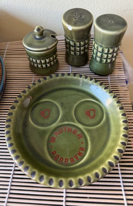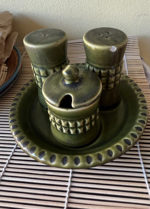 Jako stari komplet sa slike, star preko 50 godina. Posuda za biber ima oštećenje, te poklopac na manjoj posudi. Vidi se na slikama.