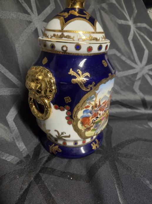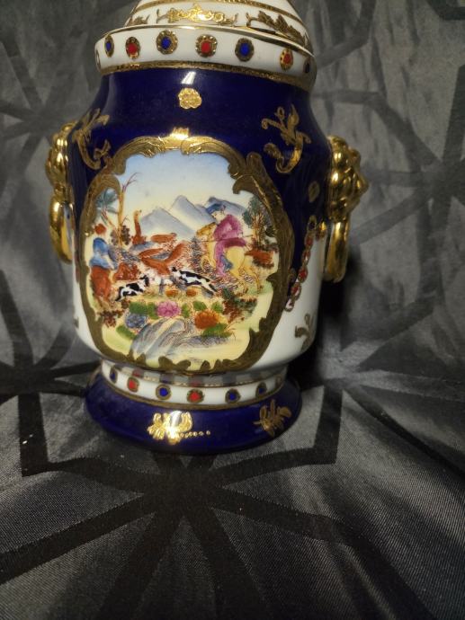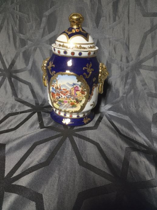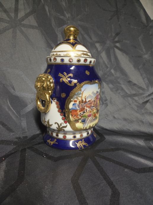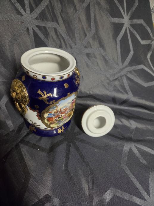 U kobalt plavoj sa deco glavama lava u pozlata boji. Bez oštećenja. Dimenzije 25,6/17 cm .
