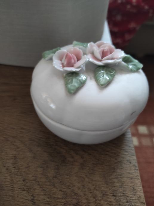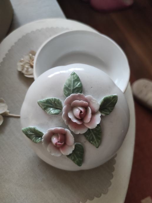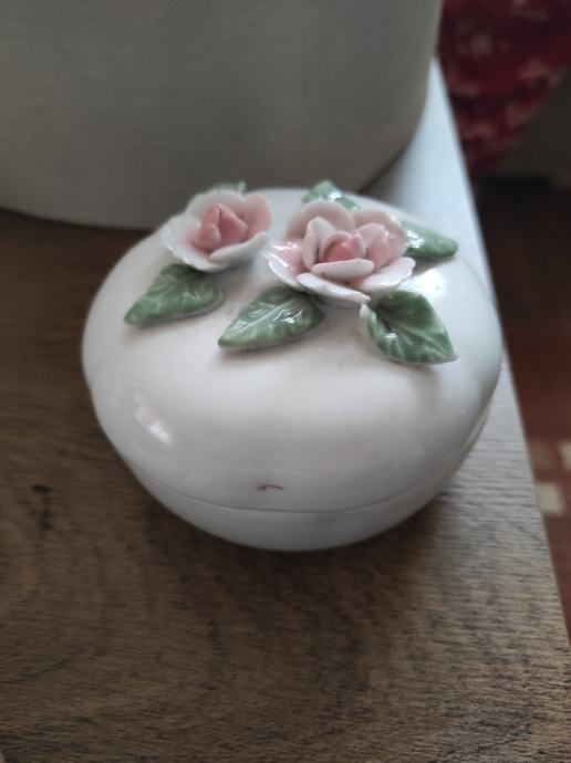 Porculanska kutija za nakit ili nesto slicno,Siroka 10 cm promjera.Stanje je odlično bez oštecenja.Za sve informacije nazovite na broj 097-6601365 ili pošaljite upit na Viber ili Njuskalo, a Šaljem Poštom ili Tiskom ili u dogovoru sa kupcem.Vidi slike!!