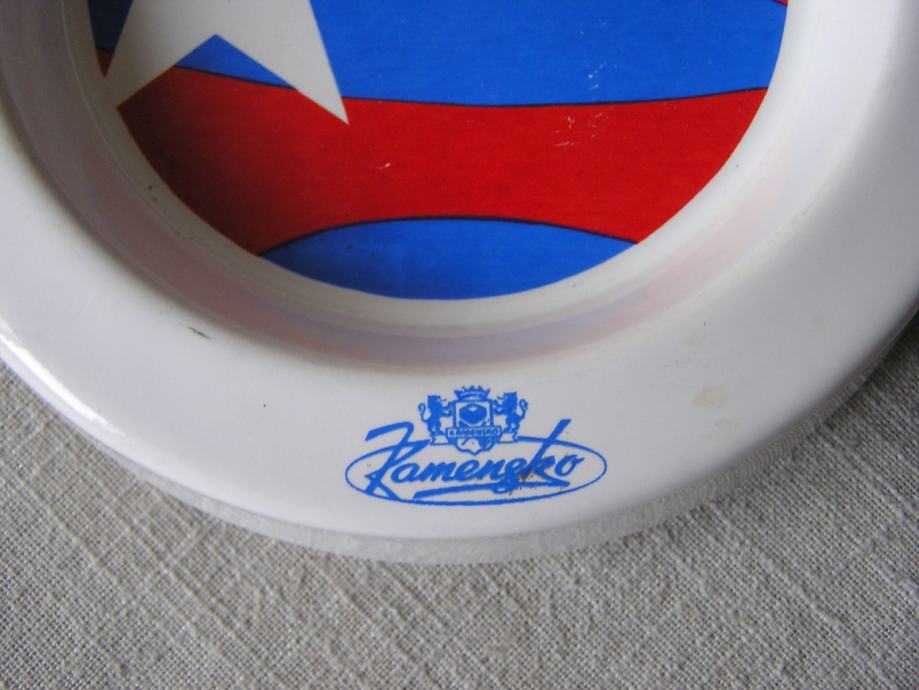Velika porculanska pepeljara iz zlatnog doba zagrebačke tekstilne tvornice Kamensko. Prilično je masivna jer ima dvostruko dno. Na 2 mjesta je malo okrhnuta i vanjski dio dna ima tanku zrakastu napuklinu koje zbog dvostrukog dna nema s prednje strane. Sve je vidljivo na slikama.