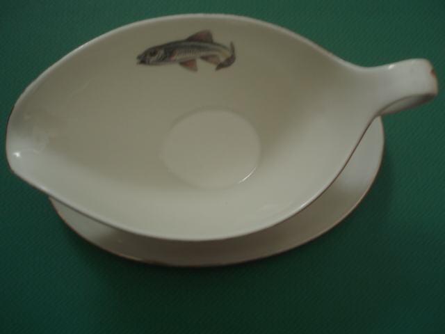 prekrasna posuda za sos s motivom ribe sa unutrašnje strane, neoštećena, pozlaćeni rub, na dnu oznaka Hyaldenberg Bavaria, promjer otvora 16x10 cm