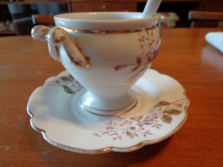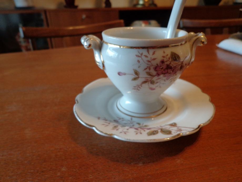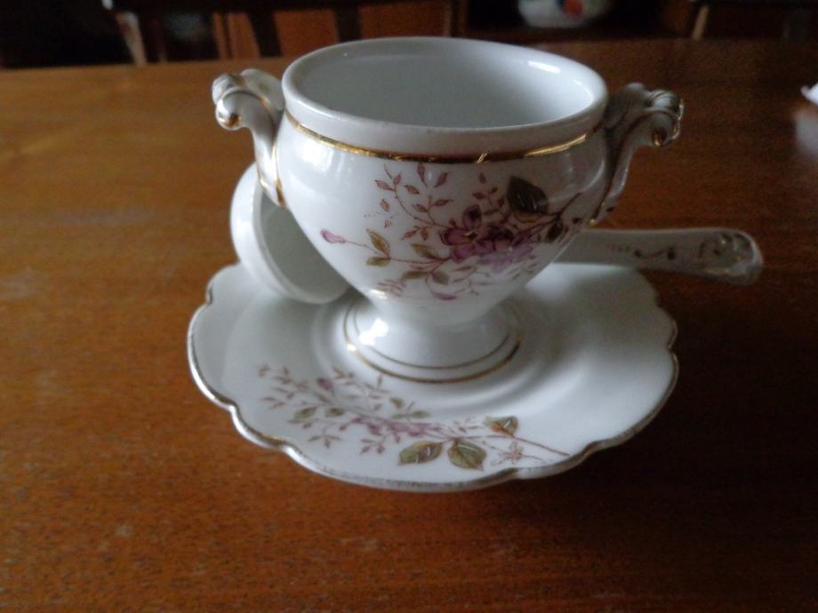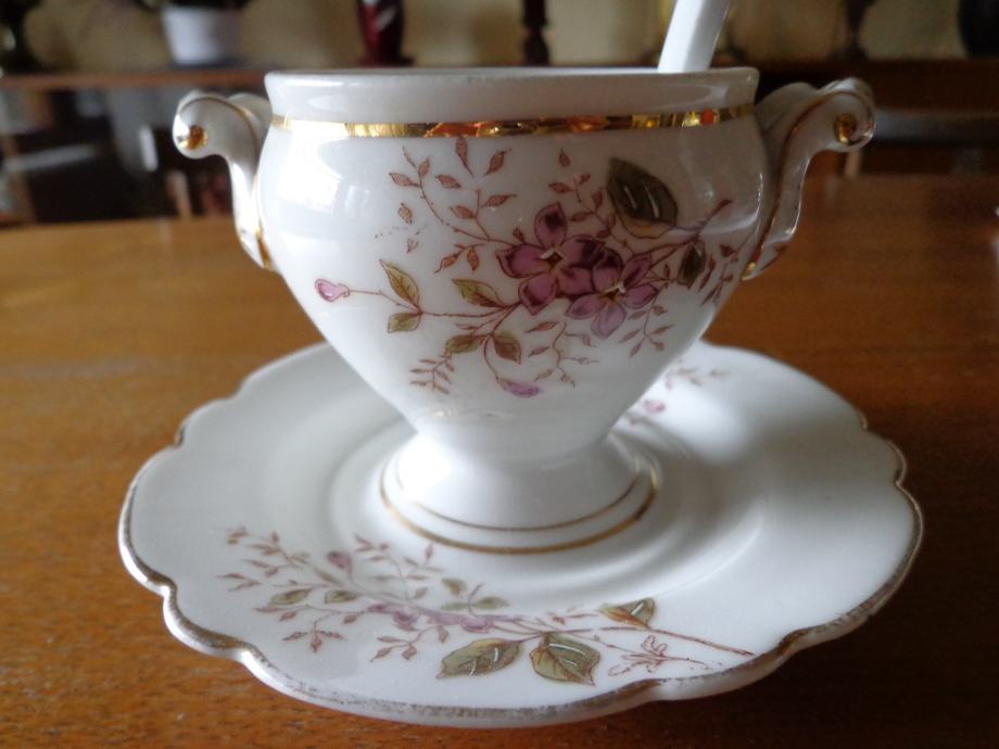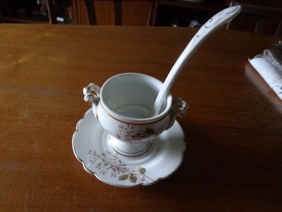 Prelijepa starinska porculanska posudica za umake s malom šeflicom. Datira između dva svjetska rata. Nigdje oštećena, stajala u vitrini. Dubina 7,5cm, visina s tanjurićem 9,5cm. Širina 14,5cm, šefla 18cm.