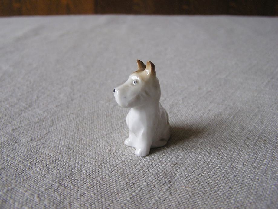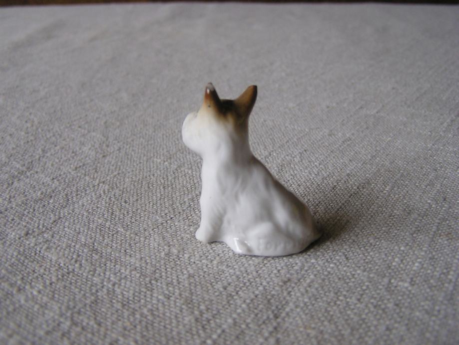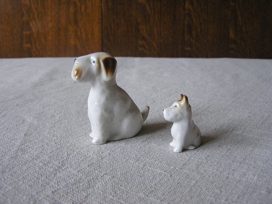 Dvije male porculanske figurice psića, mislim da su iz pasmine terijera. Nemaju oznaku ni žig, ali su kvalitetno izrađene i u odličnom stanju.