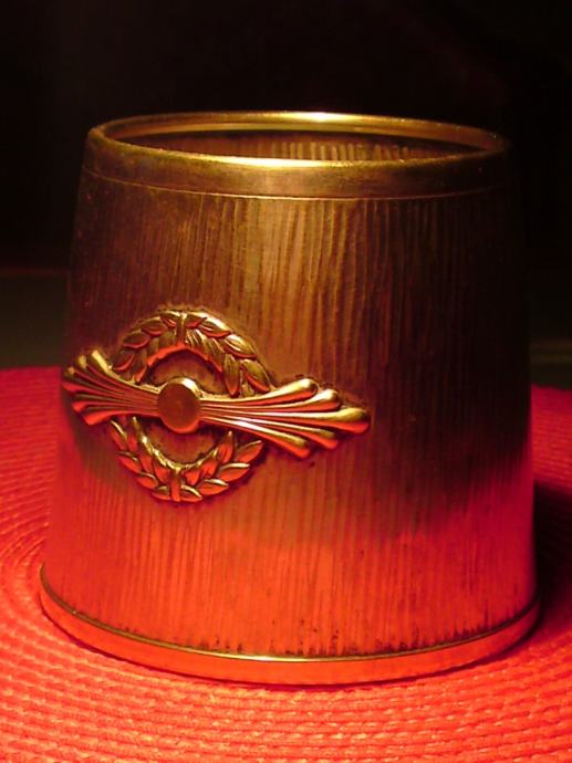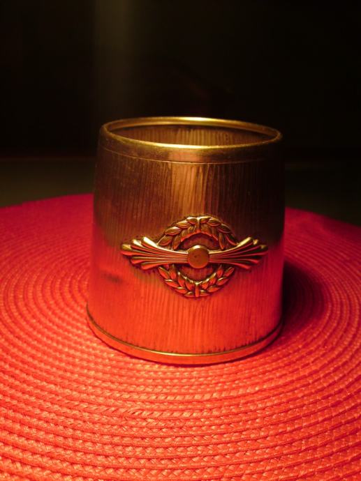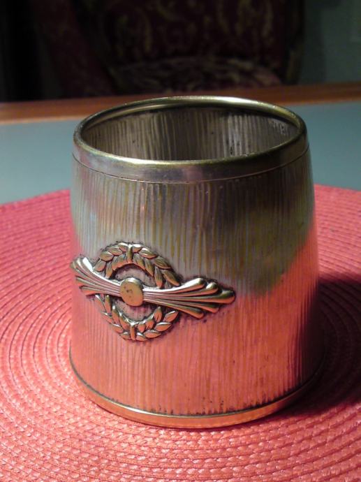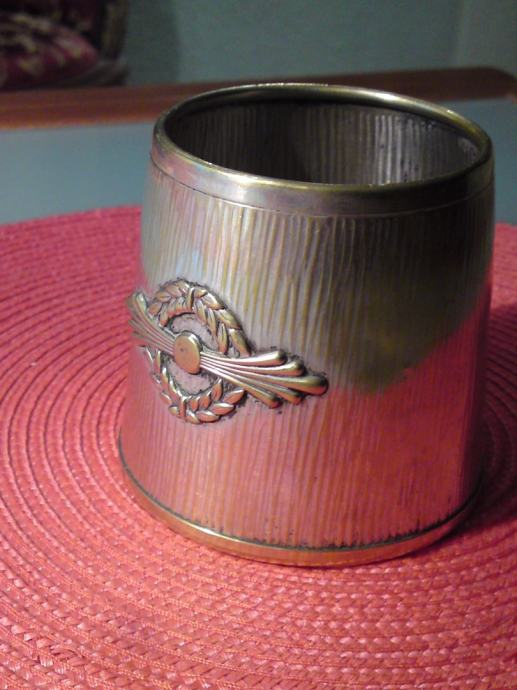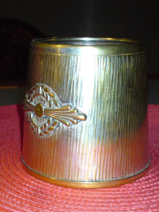 Stara posuda od posrebrenog kositra , proizvođać: Argentor, Beč, iz perioda secesije; visina: 8,5 cm; promjer stope: 9,0 cm.