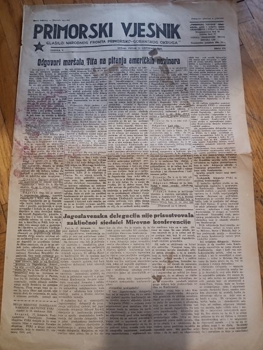 Prodajem Primorski vjesnik iz 1947g, dobro stanje. Plačanje na račun ili gotovina.