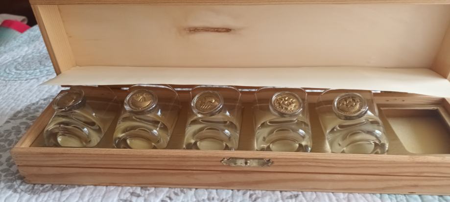 Prodajem 5 komada čašica Old Sailer Schnaps -Glaschen mit Gold -Munzsiegel za likere i ljuta alkoholna pića.Proizvod je iz Njemačke ,lijep kolekcionarski primjerak.Posvećene su pozlata Lord Nelson, Marco Polo,Wikinger ,H.M.S.Bounty,Christofer Columbo .
