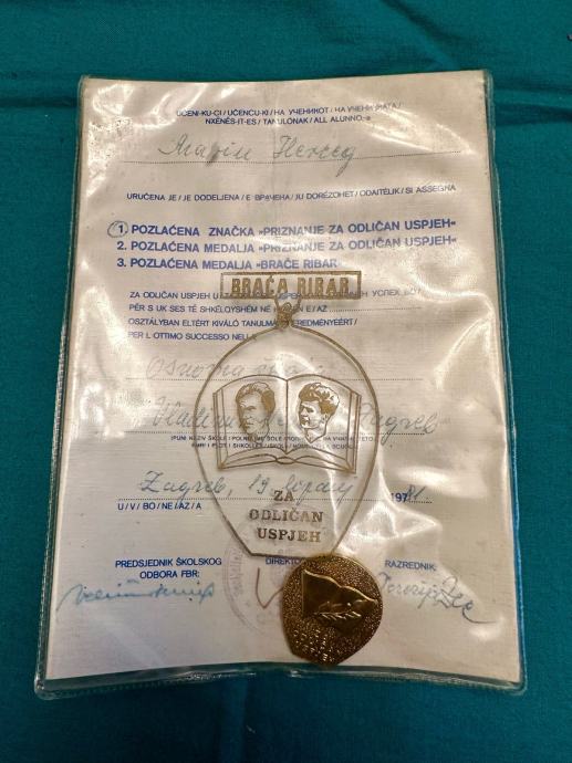 Prodajem izvrsno očuvan, autentičan komplet priznanja Fonda "Braća Ribar" dodijeljen 1974. godine u Zagrebu. Riječ je o prestižnom učeničkom odlikovanju iz razdoblja SFRJ koje se dodjeljivao isključivo učenicima s kontinuiranim odličnim uspjehom (5.0).