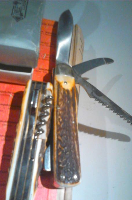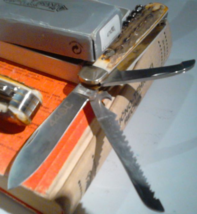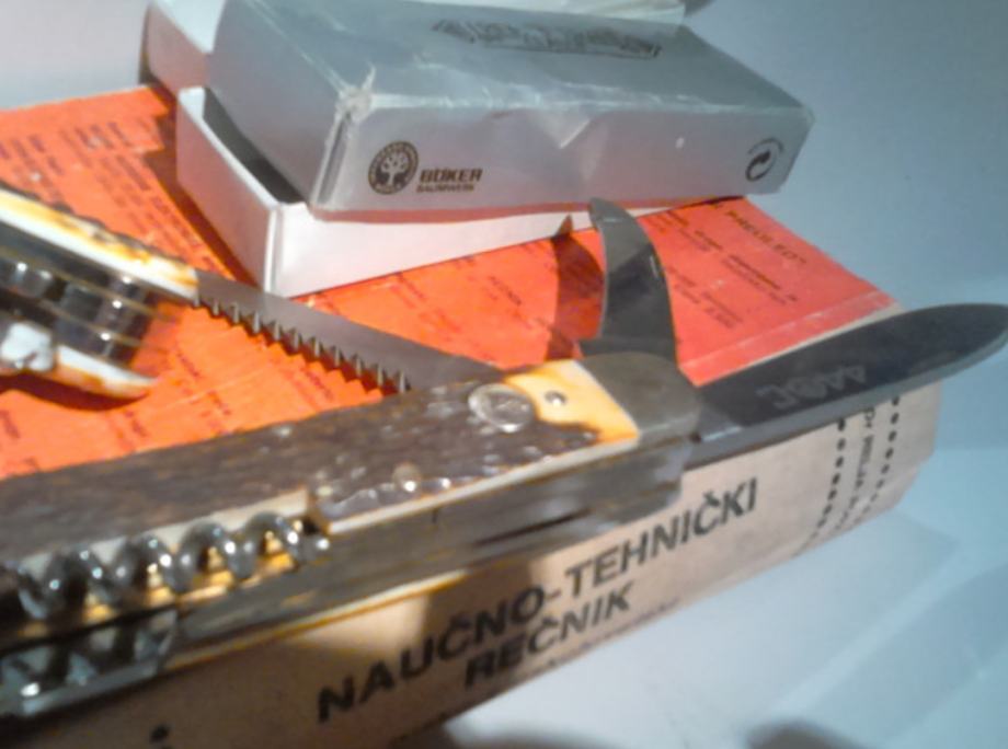 Fabričko stanje sa pakovanje.srebro na gornjoj strani drške koja je od jelenskog roga..sječiva 4različita urađena od visokokvalitetnih od vojnog čelika 440c 400grama težine masivan planinarski . Lovački.. kolekcionarski praktičan . rasklopivo đepni nož kolekcionare da ne spominjem.