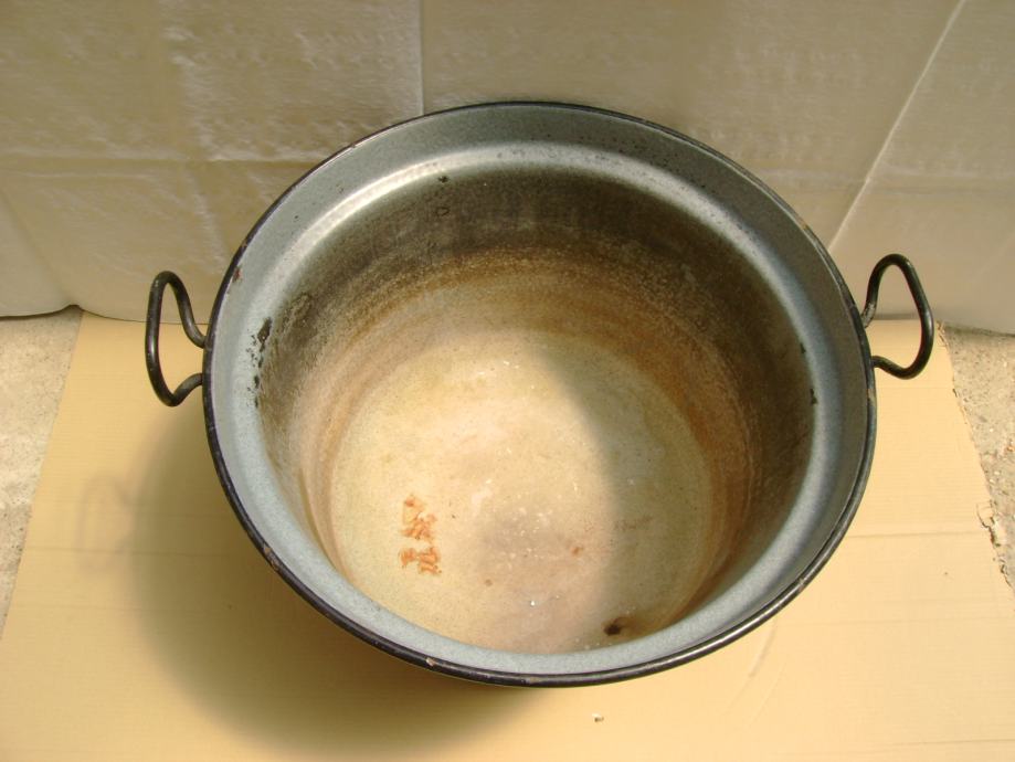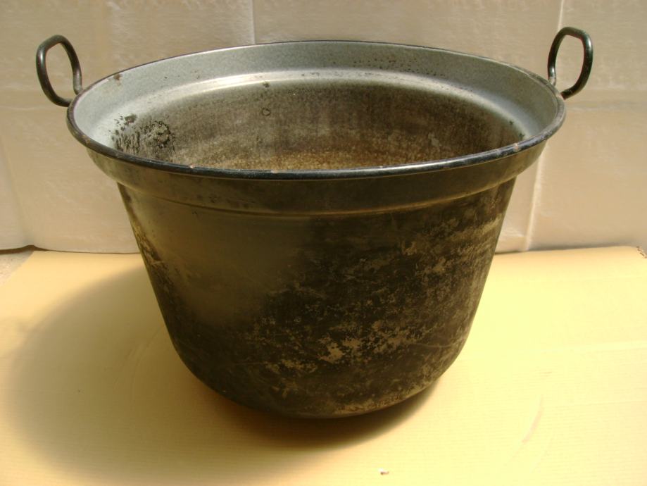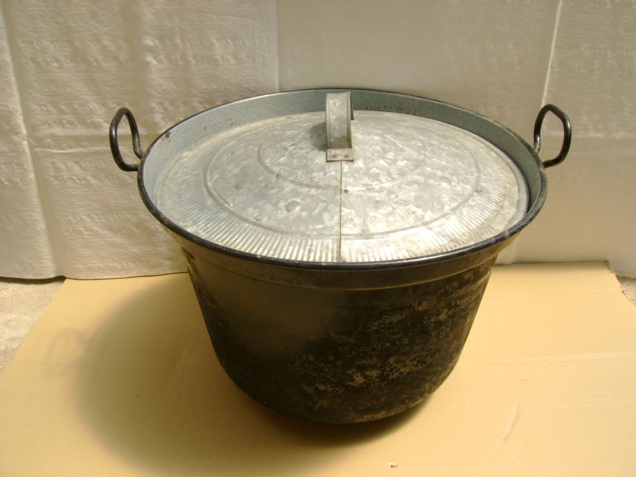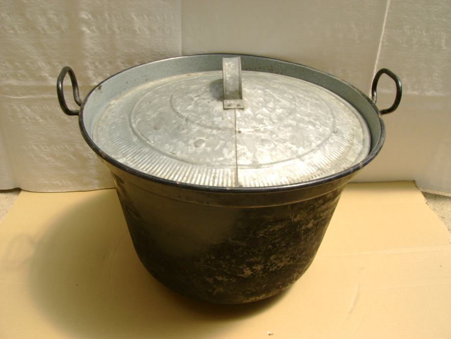 Veliki stari kotao za kuhanje sa pocinčanim poklopcem, vanjski promjer 58 cm, visina 39 cm, korišten u ljetnoj kuhinji (u zidanoj peći), vrlo dobro očuvan - stanje je vidljivo na slikama.