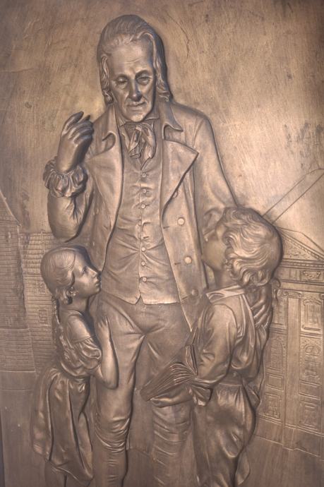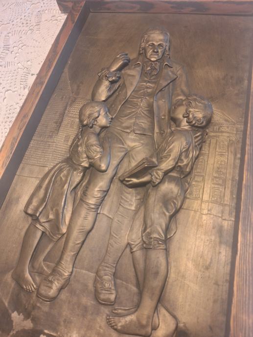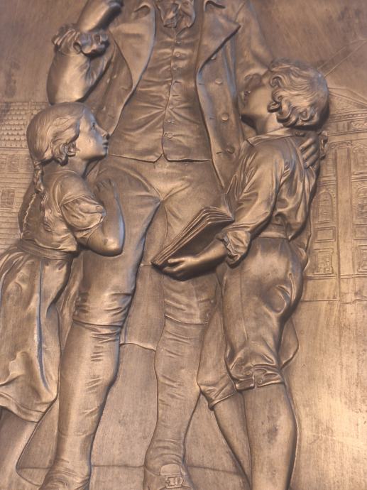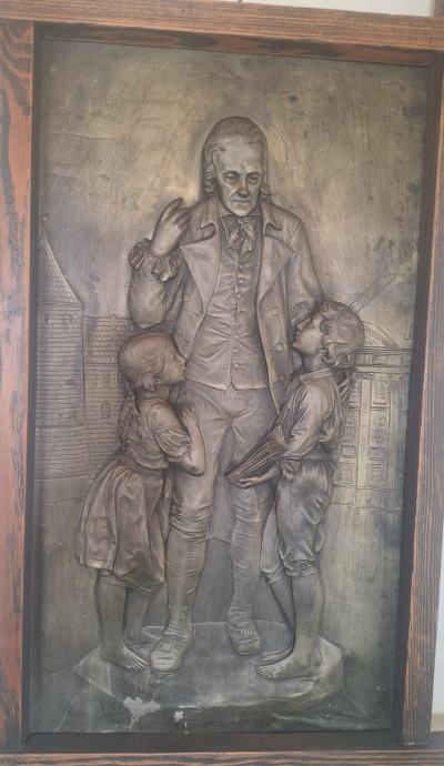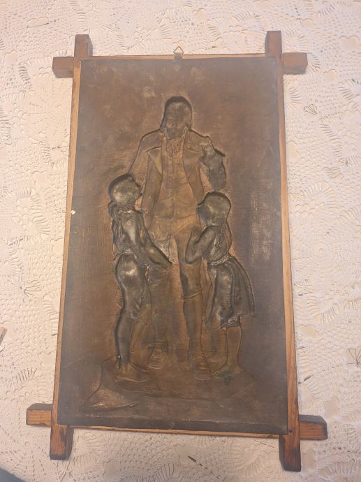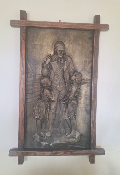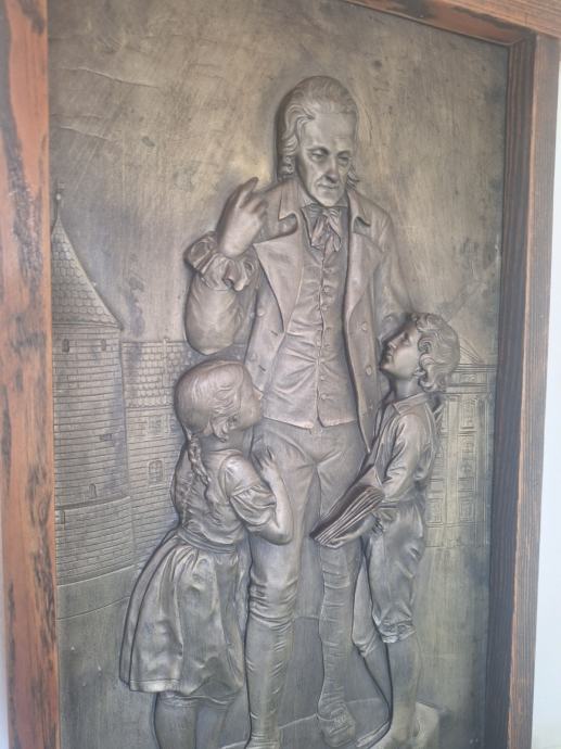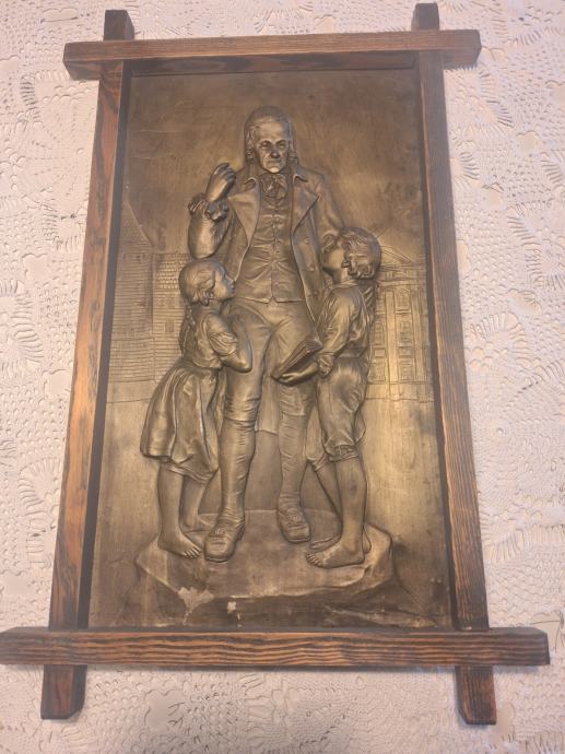 Prodajem zidni metalni reljef s prikazom Johanna Heinricha Pestalozzija (1746.–1827.), izrađen u repusé tehnici (ručno iskucavanje metala).