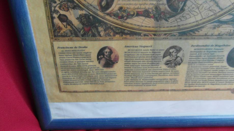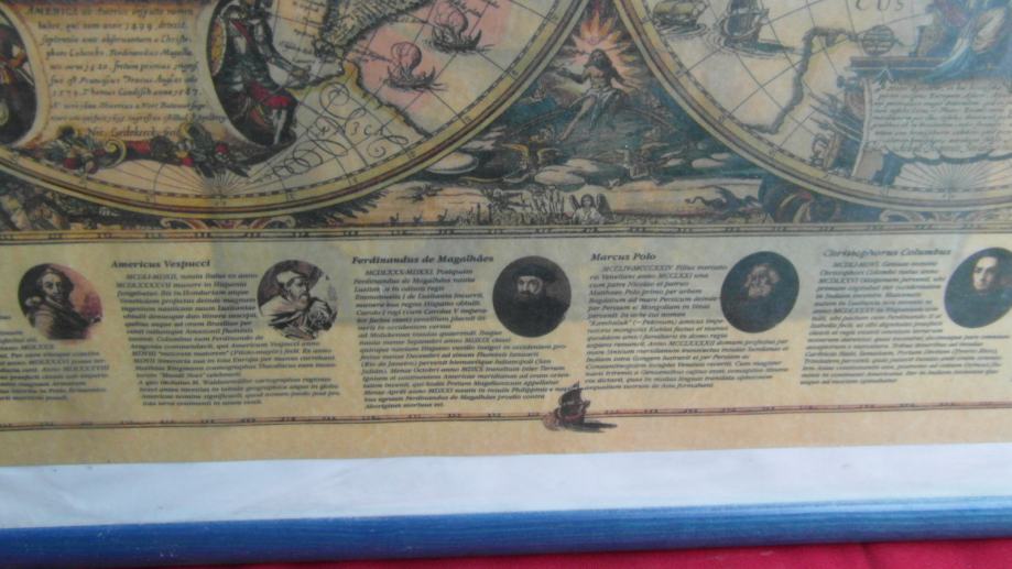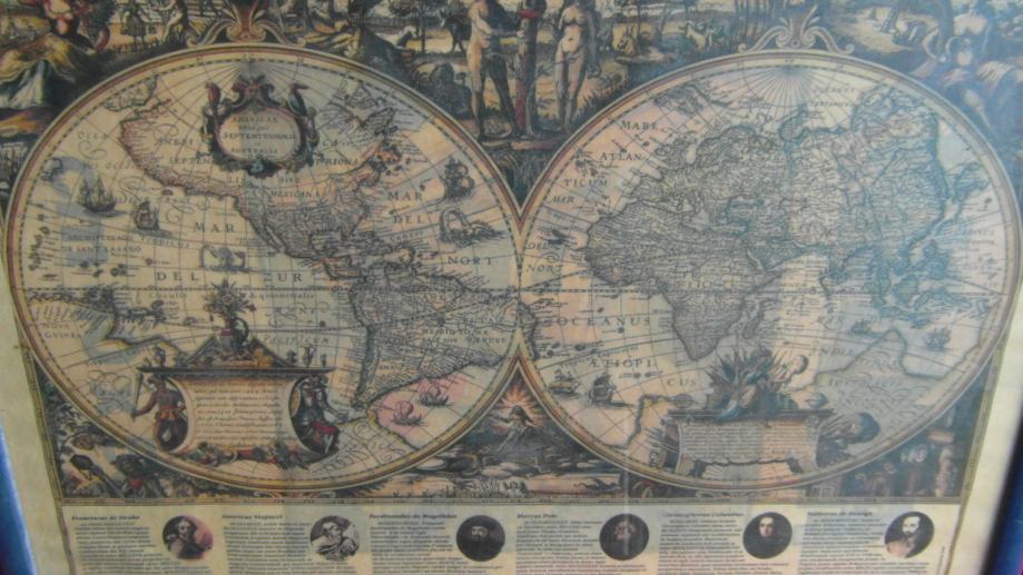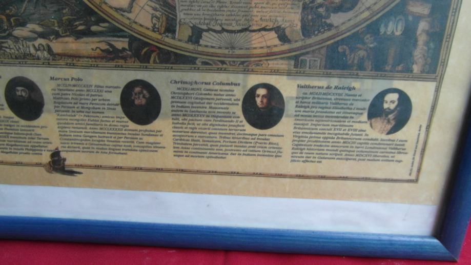 Replika stare karte svijeta sa slikama poznatih svjetskih putnika. Dimenzije karte sa okvirom su 52 x 43 cm.
