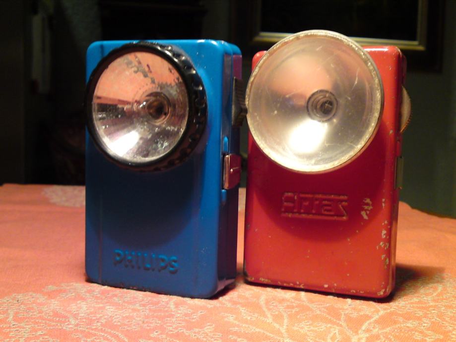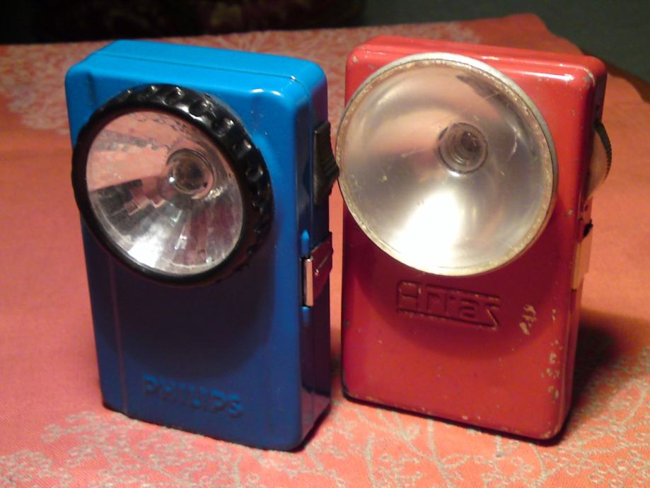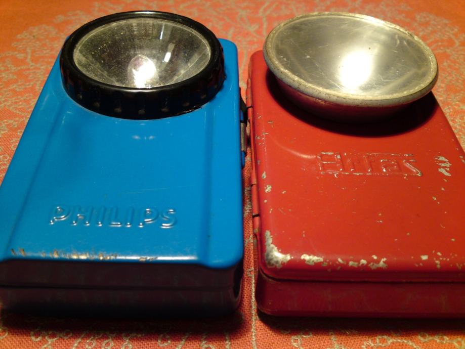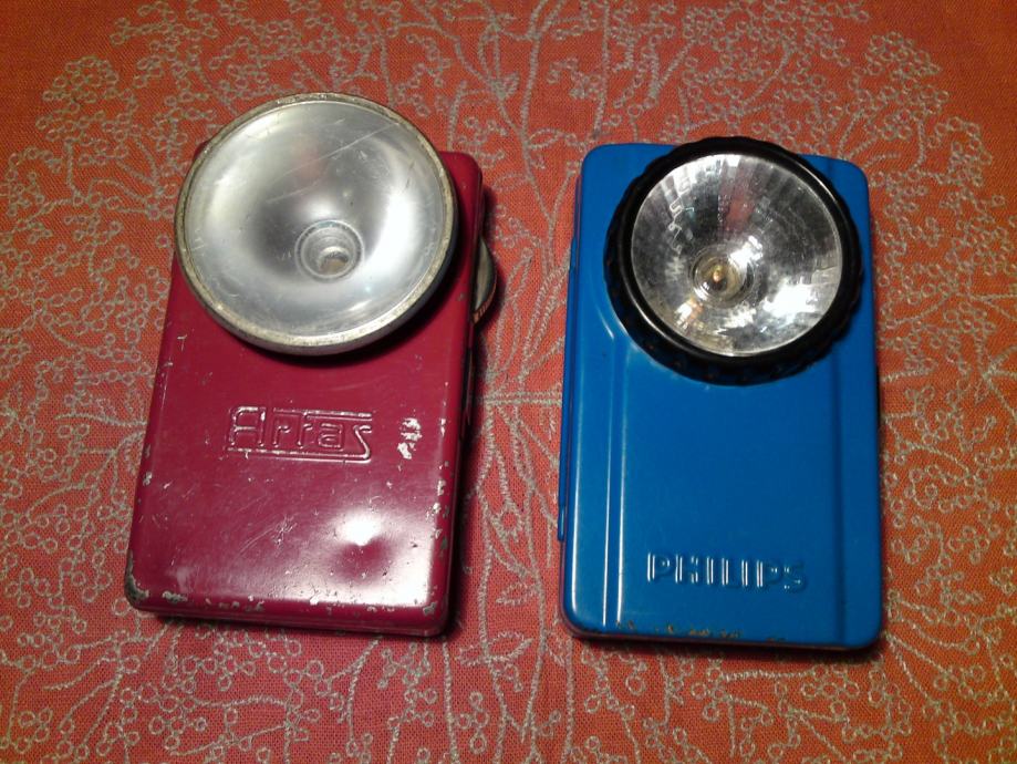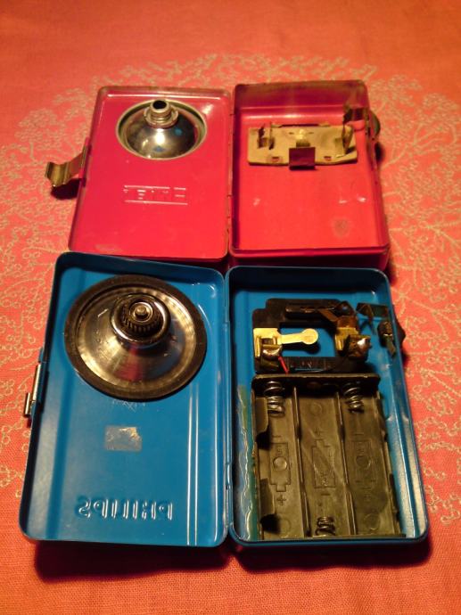 Dvije retro baterije - džepne - plava i crvena; na jednu i tri minjonke, Philips - plava i Aras, crvena. U funkciji.