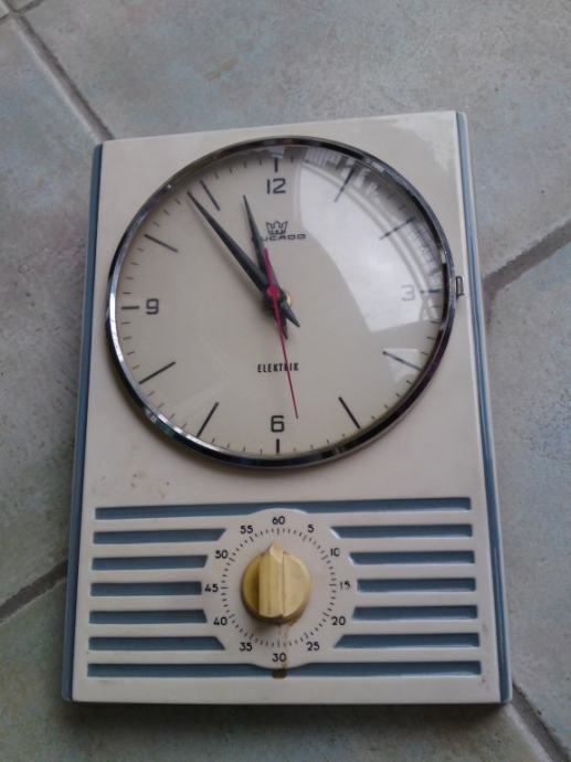 Retro porculanski kuhinjski zidni sat "DUCADO"sa tajmerom, Njemačka, odlično očuvan, kvarcni mehanizam, tajmer odbrojava, ali ne zvoni, treba ga servisirati. Za ljubitelje retro predmeta.