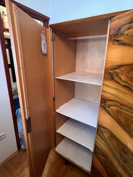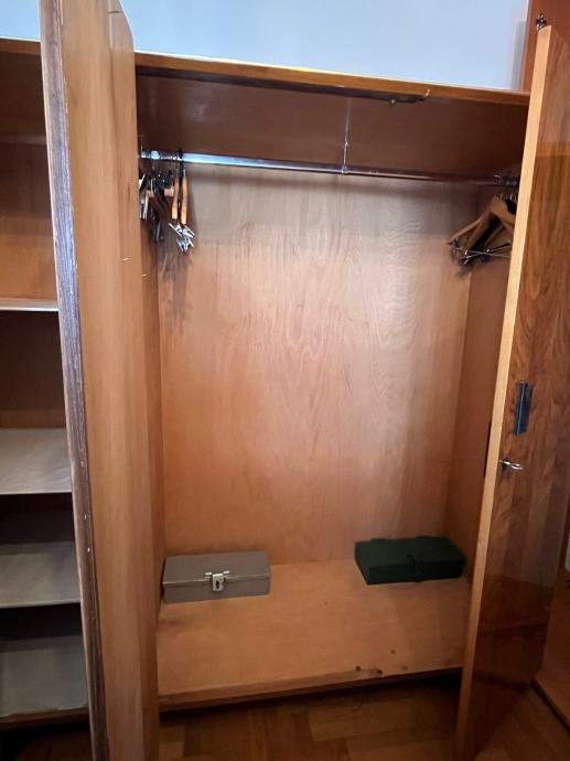 Retro ormar, lakirani, furnir orah u savršenom stanju, nigdje oštećen ili napuknut. Jedno krilo je s policama, a dvokrilni za vješalice. Uz ormar se dobiju i 2 metalna sefa sa slike. Dimenzije šxvxd 175x172x58