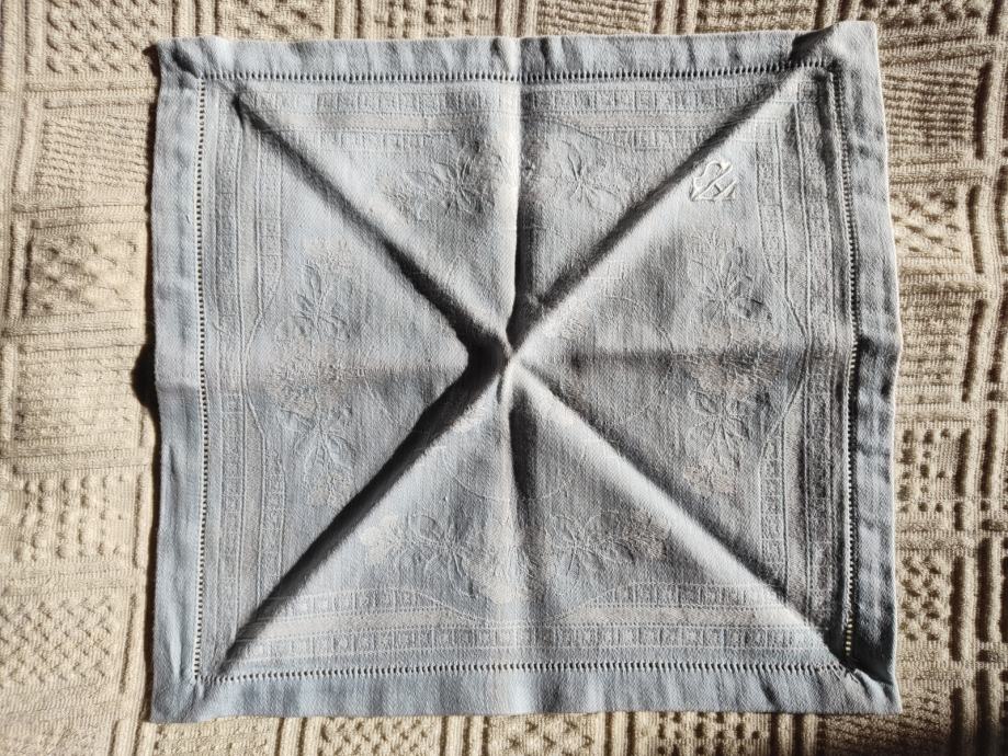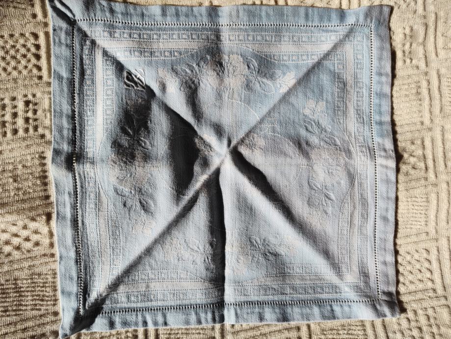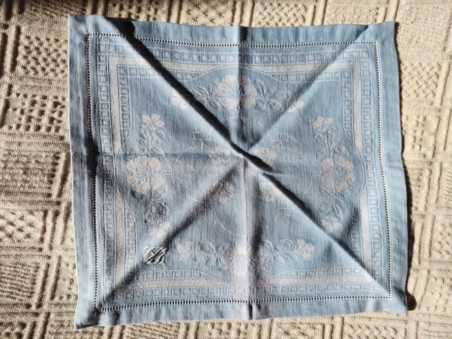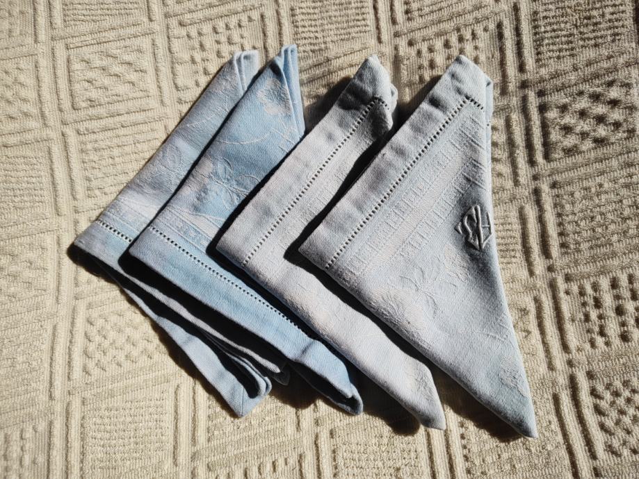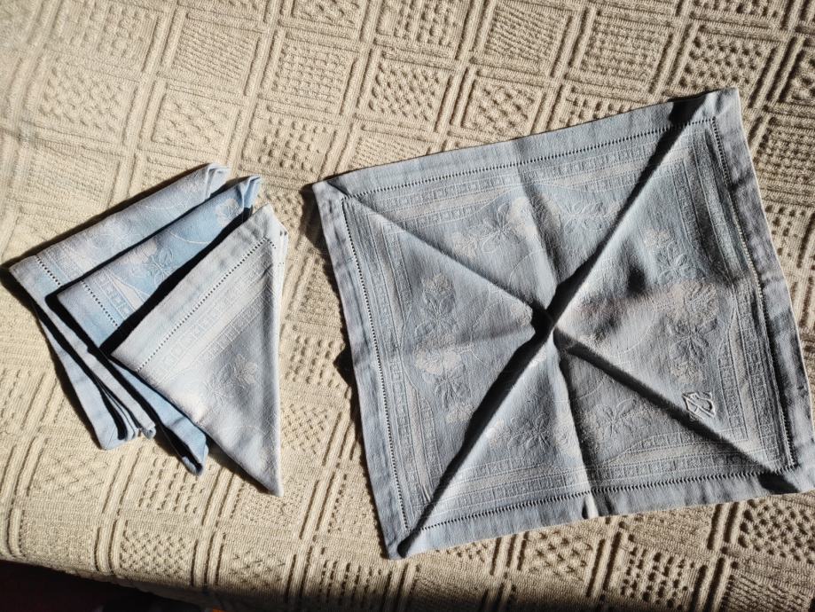 Prodajem četiri platnene salvete od damasta svjetlo-plave boje, dimenzija 31 x 32 cm.