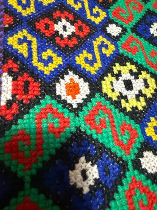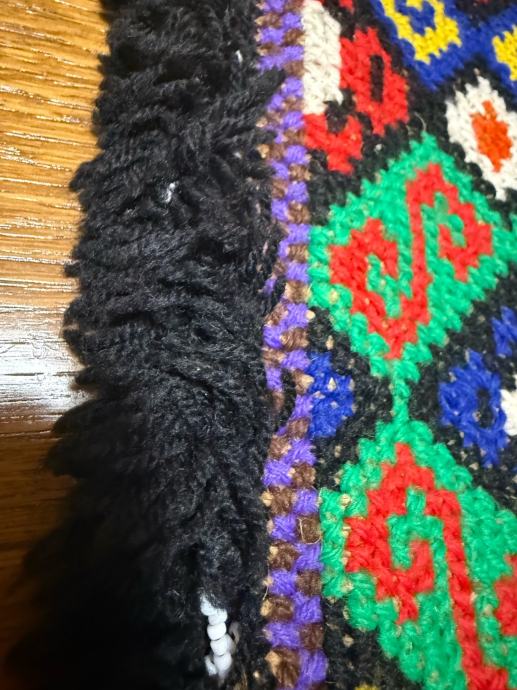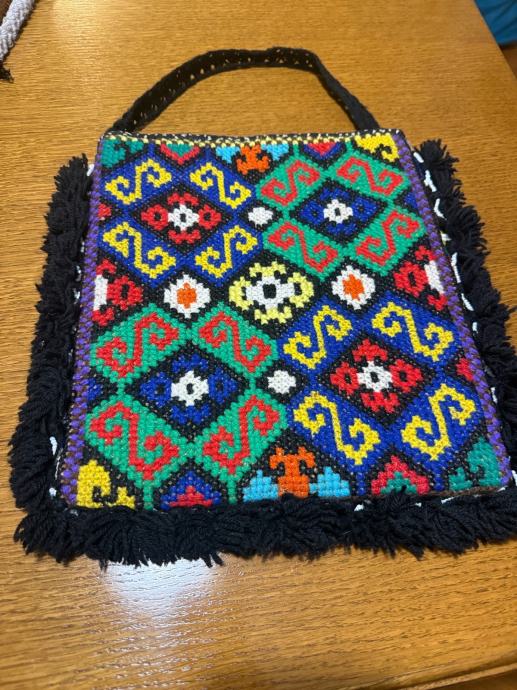 Prodajem prekrasnu retro torbu ručne izrade. Izrađena od vune s bogatim, šarenim geometrijskim uzorkom u etno stilu. Rubovi su ukrašeni resama, a unutrašnjost je podstavljena platnom.