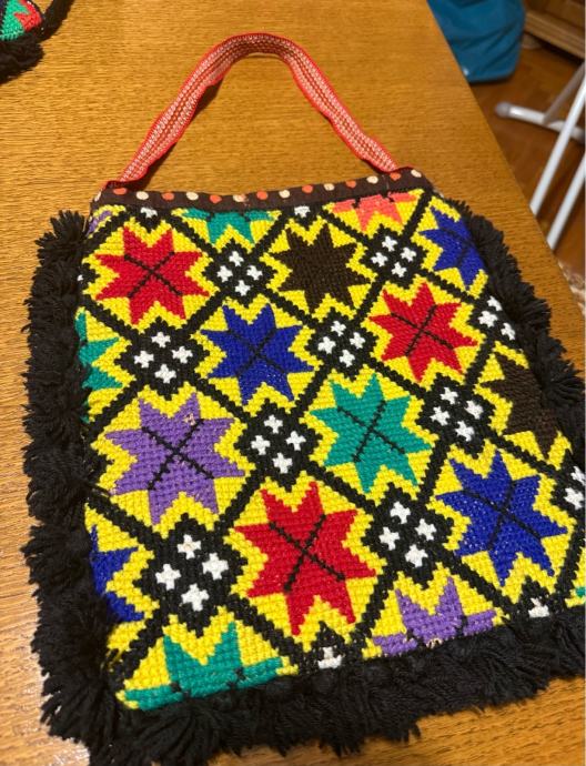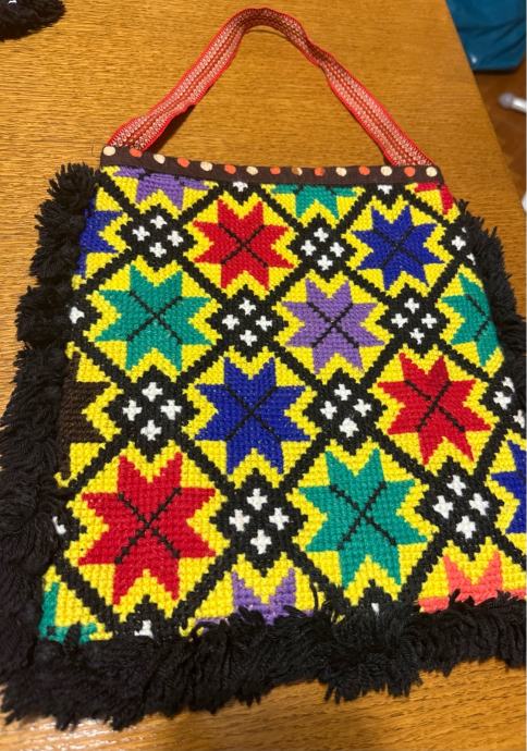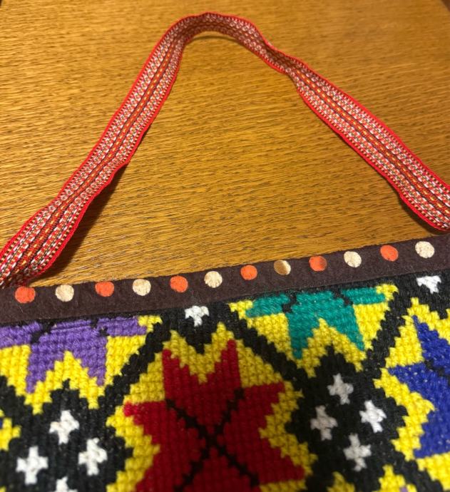 Prodajem prekrasnu retro torbu ručne izrade od vune. Bogat, šareni geometrijski uzorak u etno stilu čini je posebnim i upečatljivim komadom.