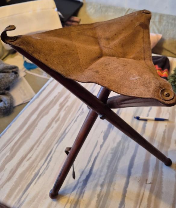 Drveni ribički stolac na rasklapanje. Sjedište je izrađeno od kože.