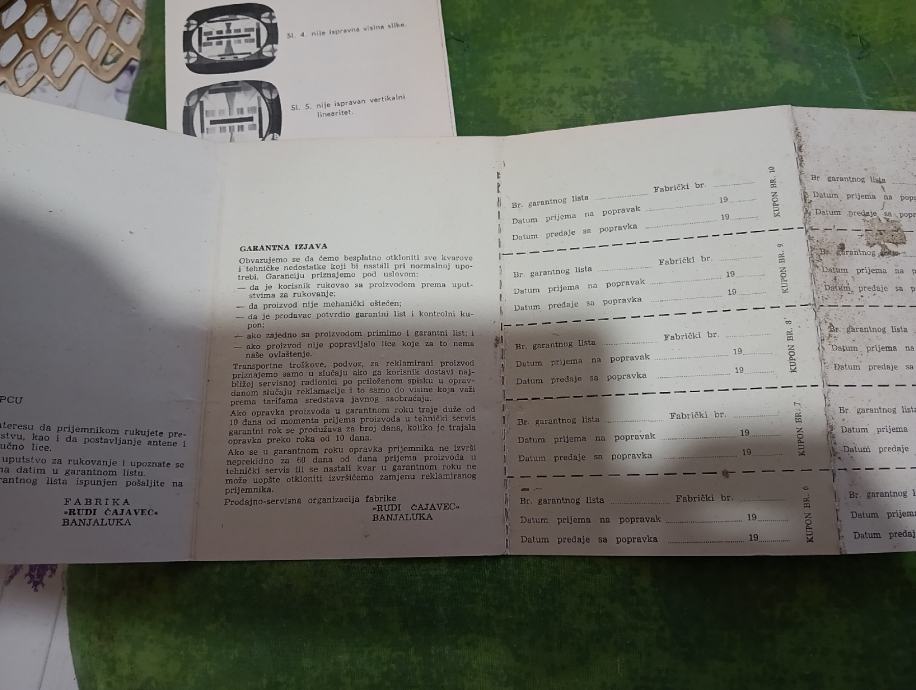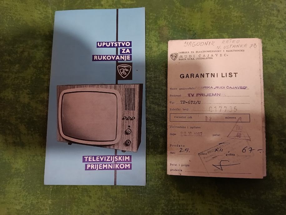 Prodajem stara uputatva za rukovanje i garancijski list televizijskog prijemnika Rudi Čajavec tip 672/U iz 1967g. Cijena za lot. Plačanje na račun ili gotovina.