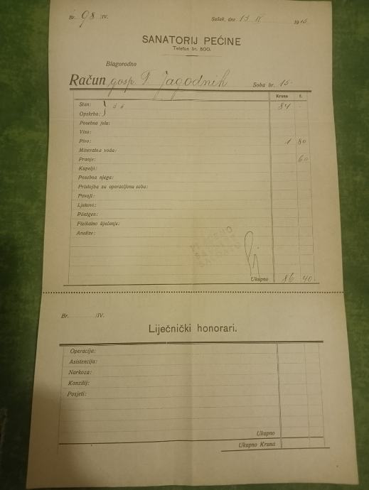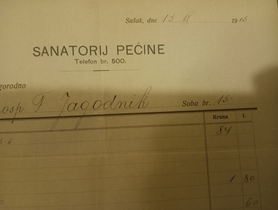 Prodajem stari račun sanatorija Pećine ( Park hotel) Sušak iz 1915g . Rijetkost. Plačanje na račun ili gotovina.