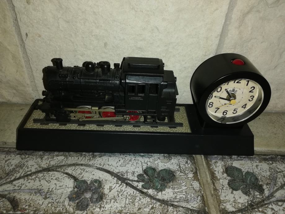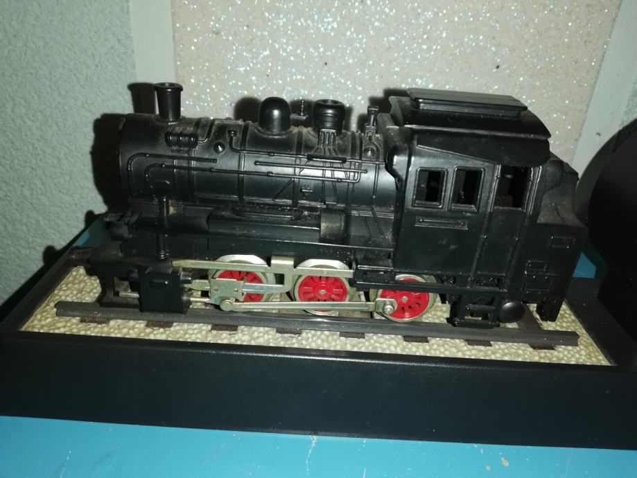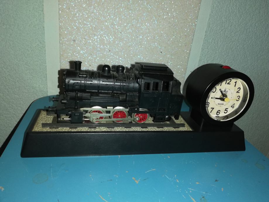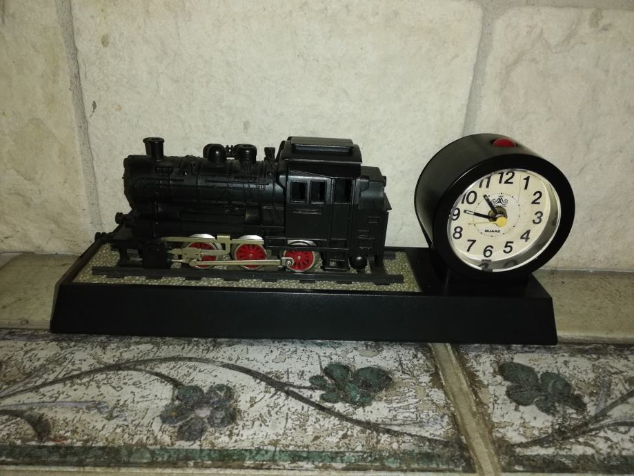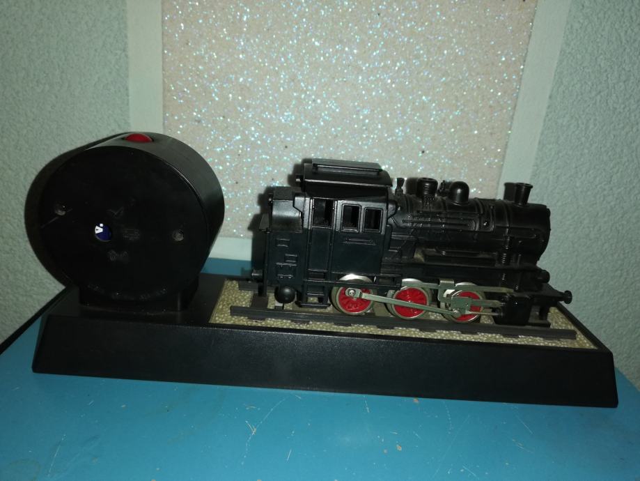 Sat stolni, lokomotiva, sat radi na 1 bateriju, lokomotiva radi na 4 baterije. Sat i lokomotiva rade samostalno, nezavisno jedan od drugog. Jedini nedostatak, što urar treba povezati ove 2 komponente, da budu usklađene. No, stolni sat je i kao takav u funkciji i prekrasna dekoracija. Sat je iz 1970-tih godina. Zbog navedenog nedostatka, cijena je znatno niža od uobičajene.