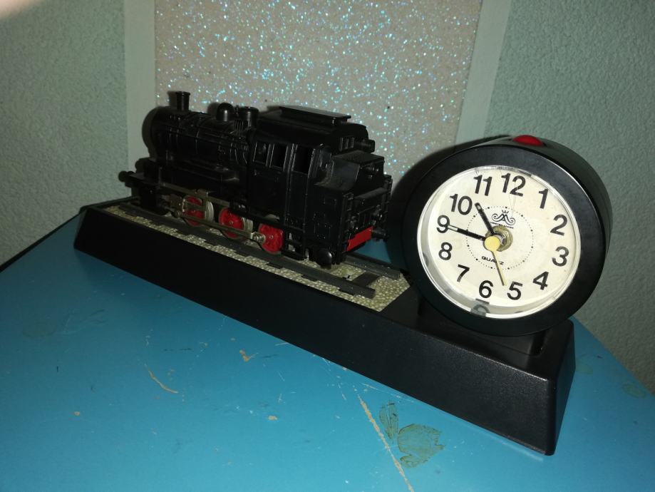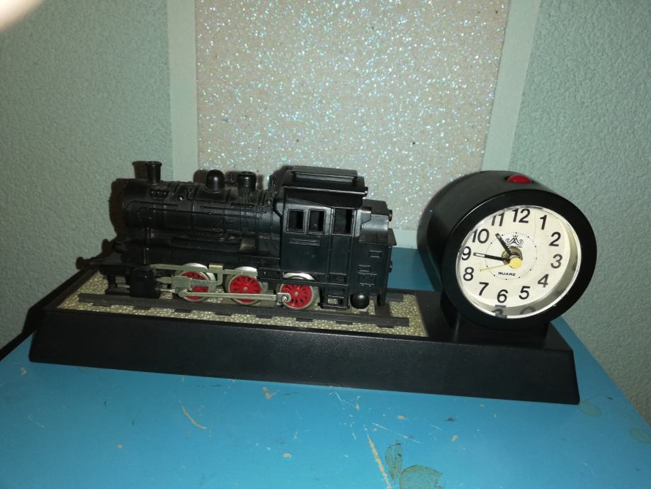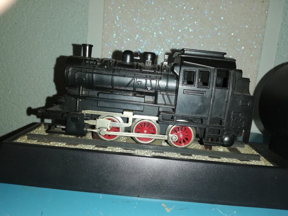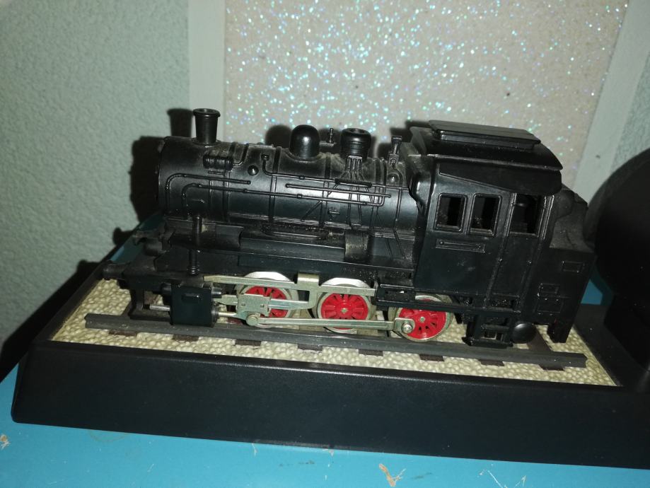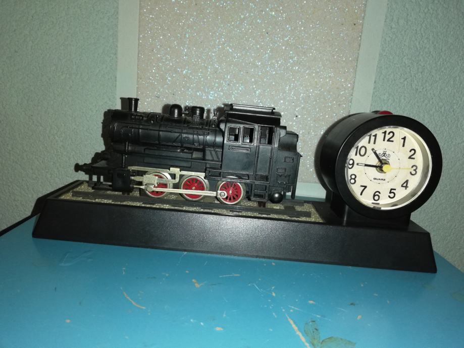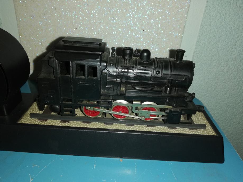 Sat stolni, lokomotiva, sat radi na 1 bateriju, lokomotiva radi na 4 baterije. Sat i lokomotiva rade samostalno, nezavisno jedan od drugog. Jedini nedostatak, što urar treba povezati ove 2 komponente, da budu usklađene. No, stolni sat je i kao takav u funkciji i prekrasna dekoracija. Sat je iz 1970-tih godina. Zbog navedenog nedostatka, cijena je znatno niža od uobičajene.