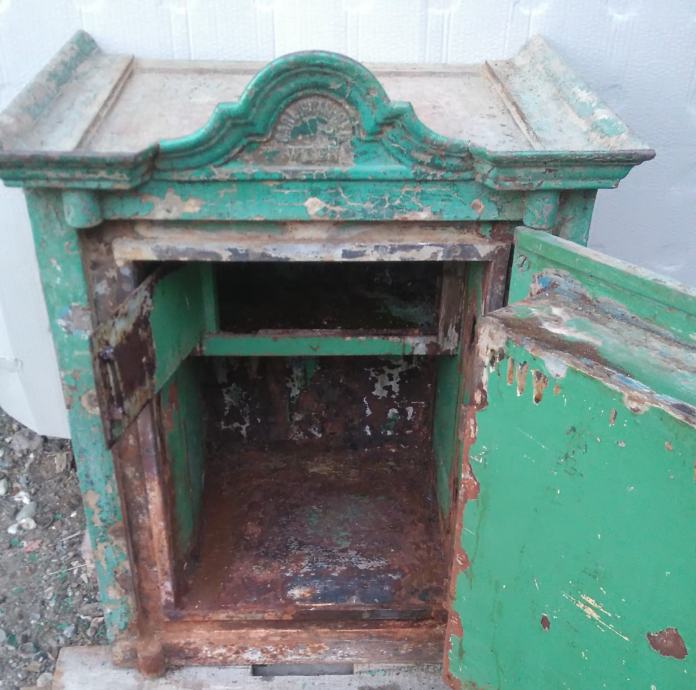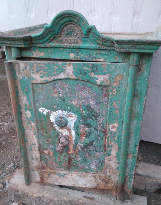 Sef je u stanju kao na slici. Obzirom da je od debelog željeza pjeskarenjem ili nekom sličnom tehnikom, može se lako urediti i vratiti u funkciju.